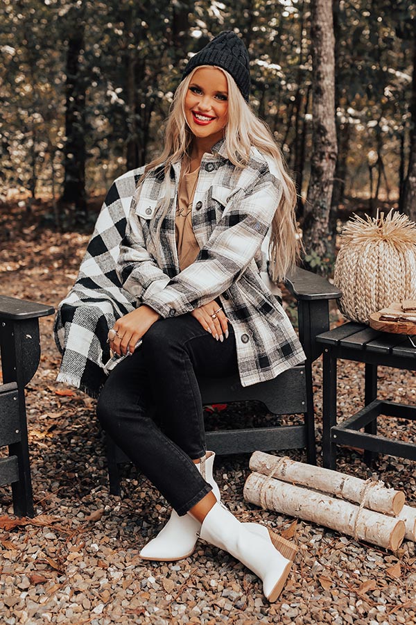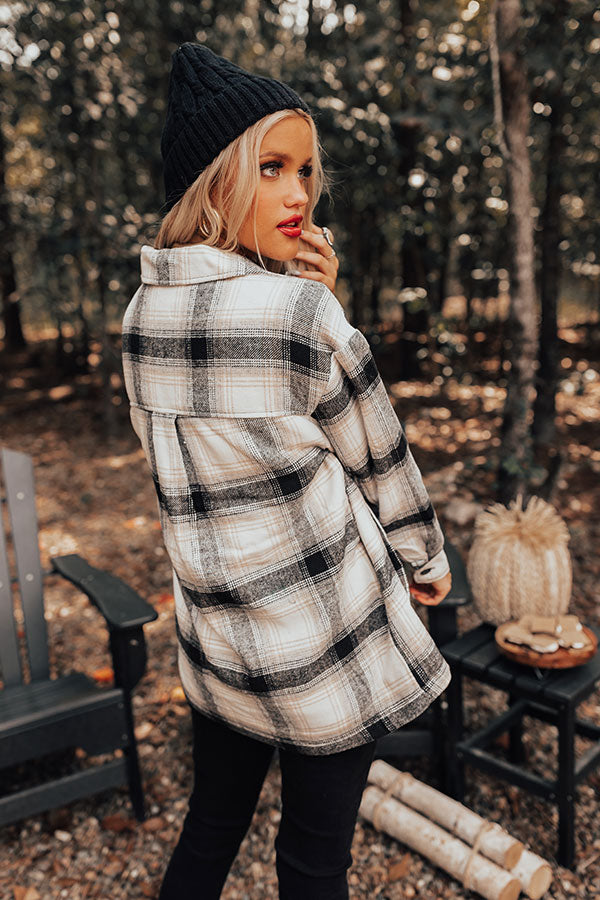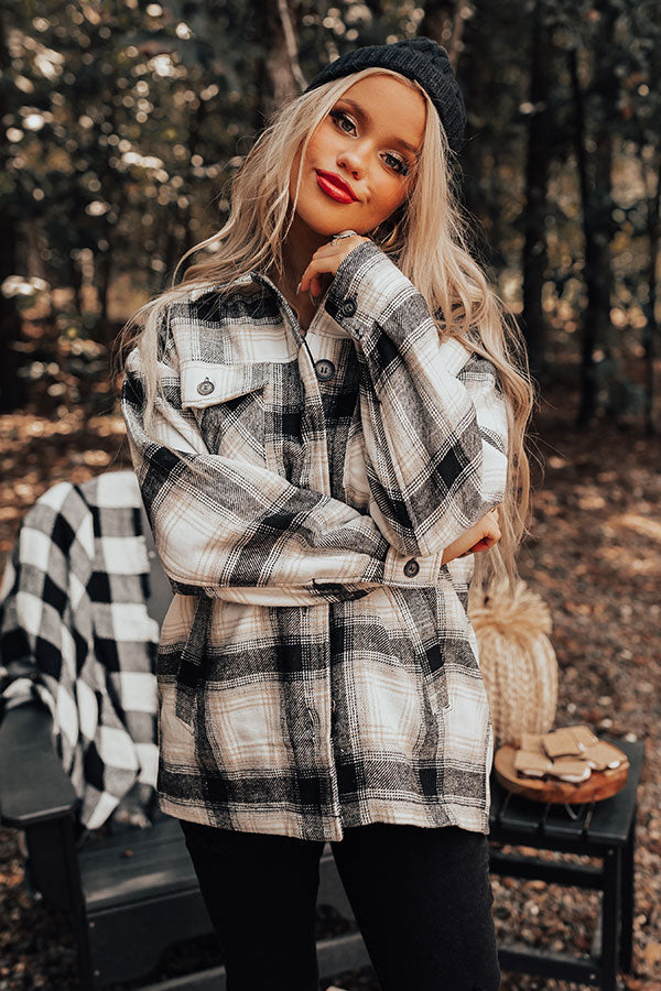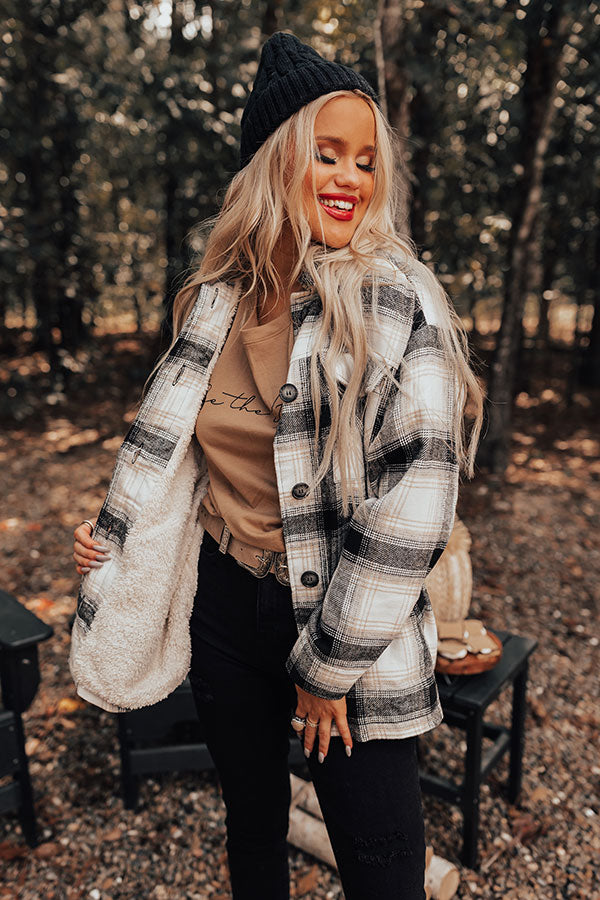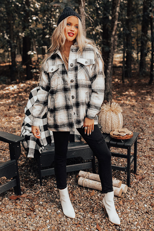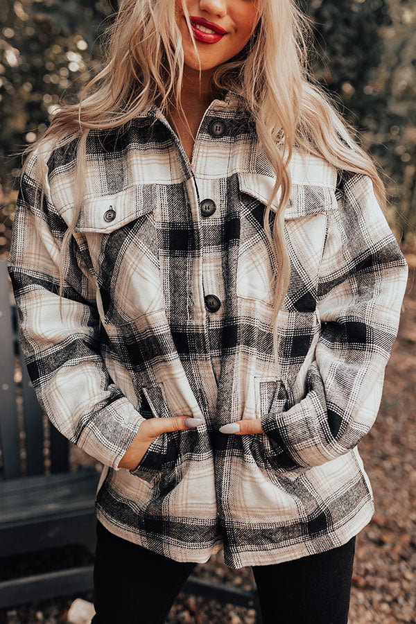 Cozy up in this gorgeous jacket featuring soft material patterned with a large white and black plaid pattern, a button down front with a collared neckline, long loose sleeves with button closure cuffs, two side pockets and two chest pockets with flap closures, and a slouched silhouette that falls into a straight hemline! PLUS, this cutie is lined with faux fur for extra warmth! Measurements