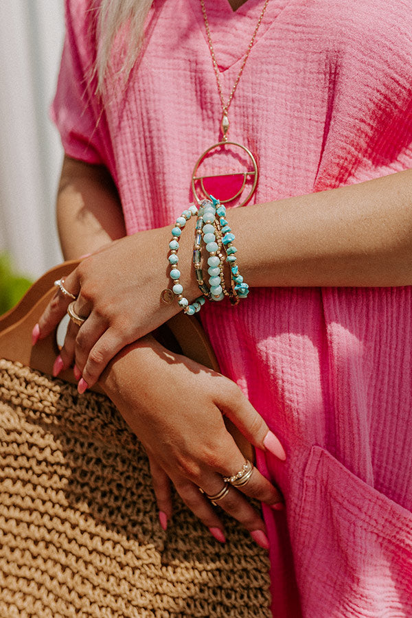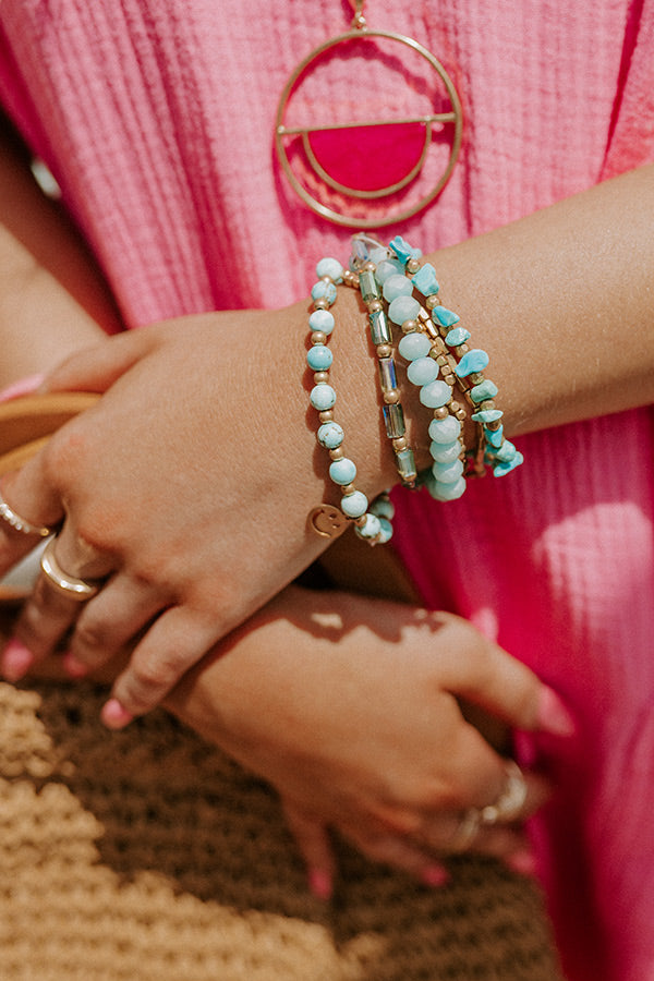 Add a pop of boho color to your look with our cute 'Crafted Experience Bracelet Set' featuring six turquoise and gold beaded stretch strands!