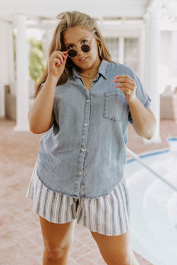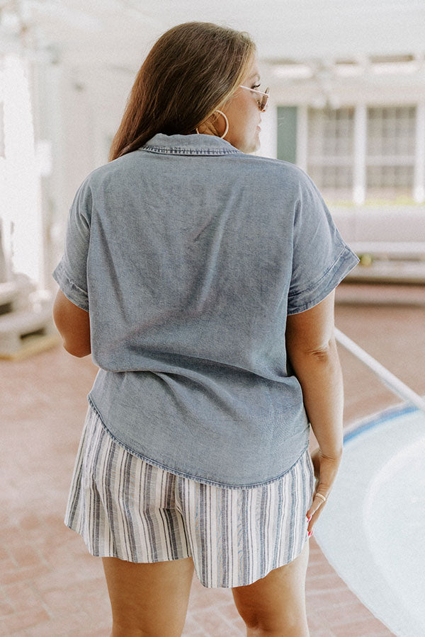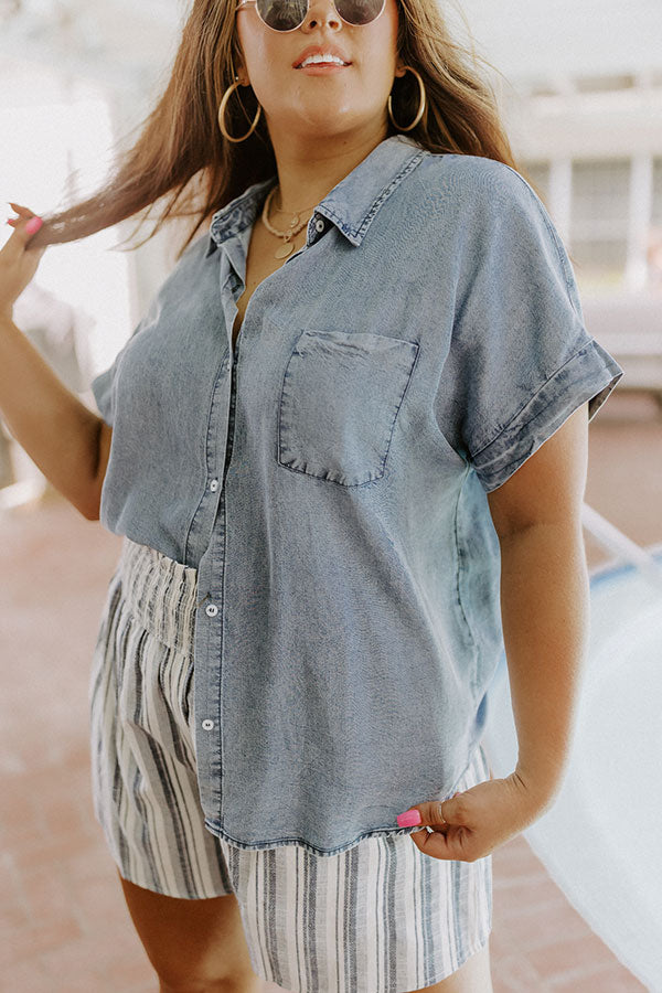 Our adorable plus size 'Crafted Experience' top features lightweight light wash chambray material, a button down front with a collared neckline, a single accent chest pocket, short sleeves, and a relaxed silhouette that falls into a rounded hemline!