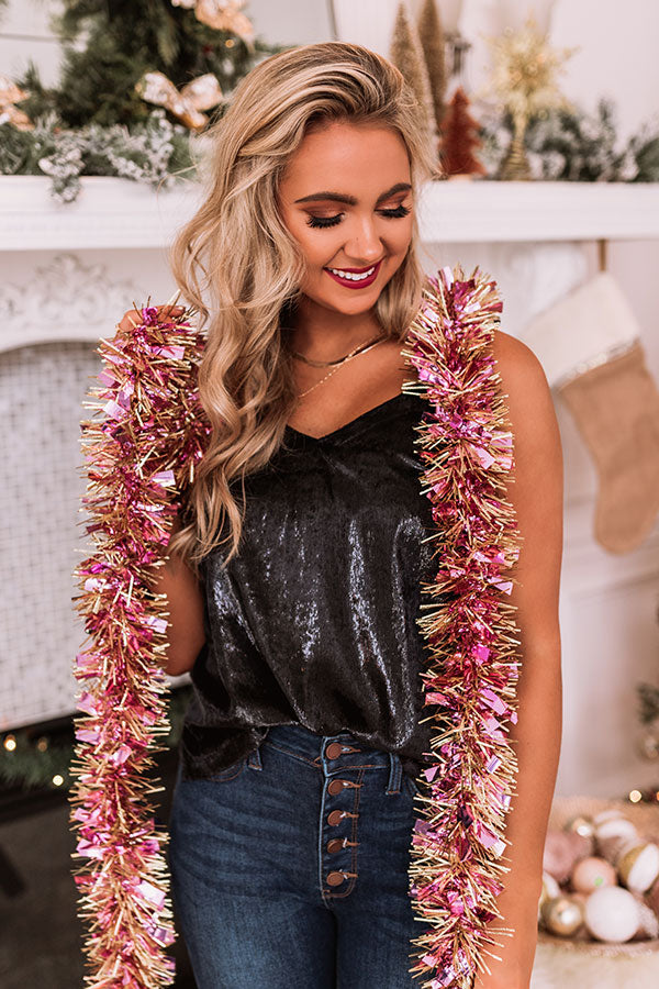 There is no better piece to layer up with for a glamorous holiday look than our gorgeous black 'Cranberry Martini' tank featuring sleek lightweight flowy velvet material, a v-cut neckline, adjustable spaghetti straps, and a relaxed silhouette that falls into a straight hemline! Measurements