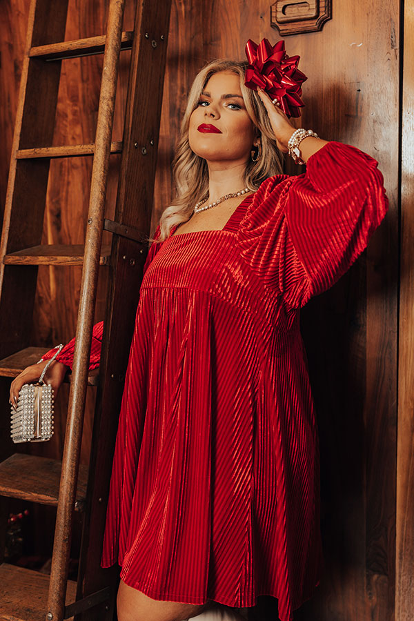 Spritz up your holiday wardrobe with this beautiful red plus size dress featuring soft velvet material with vertical ribbed texturing, a flattering square neckline and upper back with a tie closure, long oversized sleeves, hidden side pockets, and a relaxed babydoll silhouette that falls into a straight mid-thigh length hemline!
