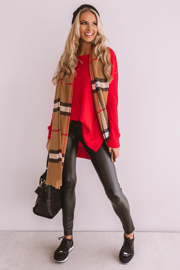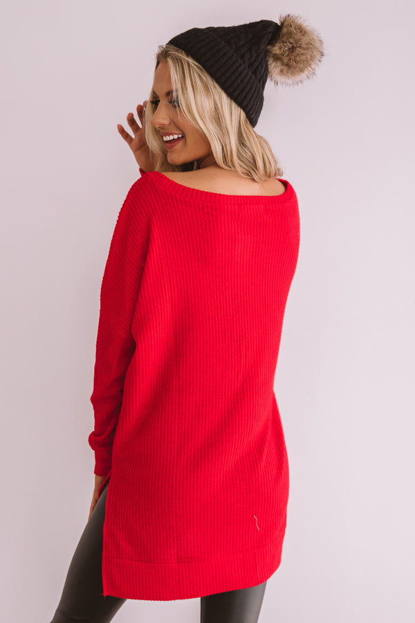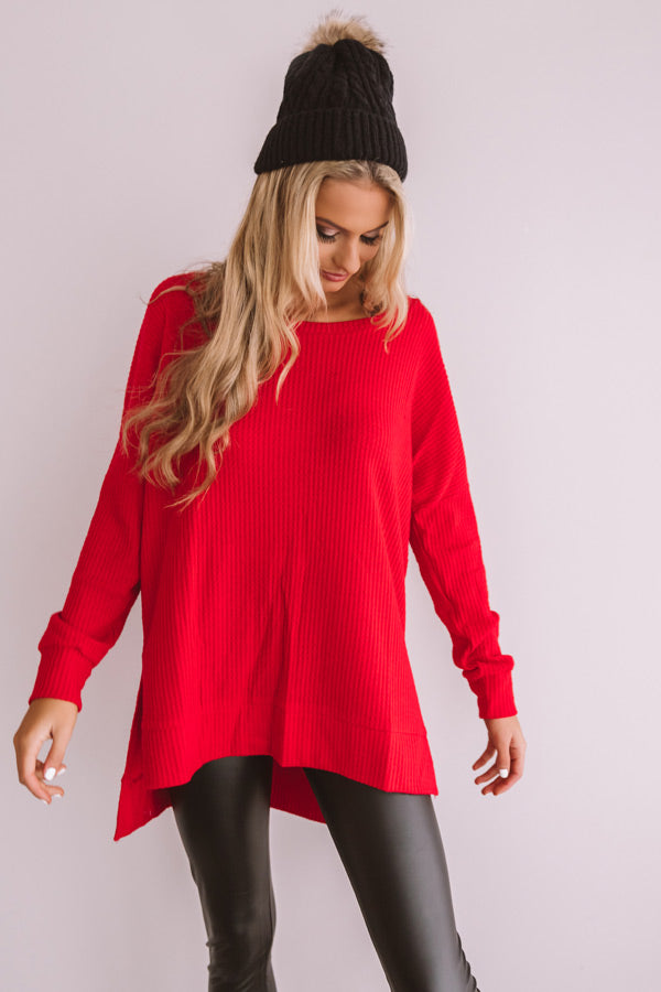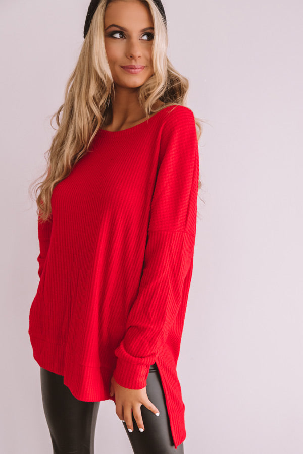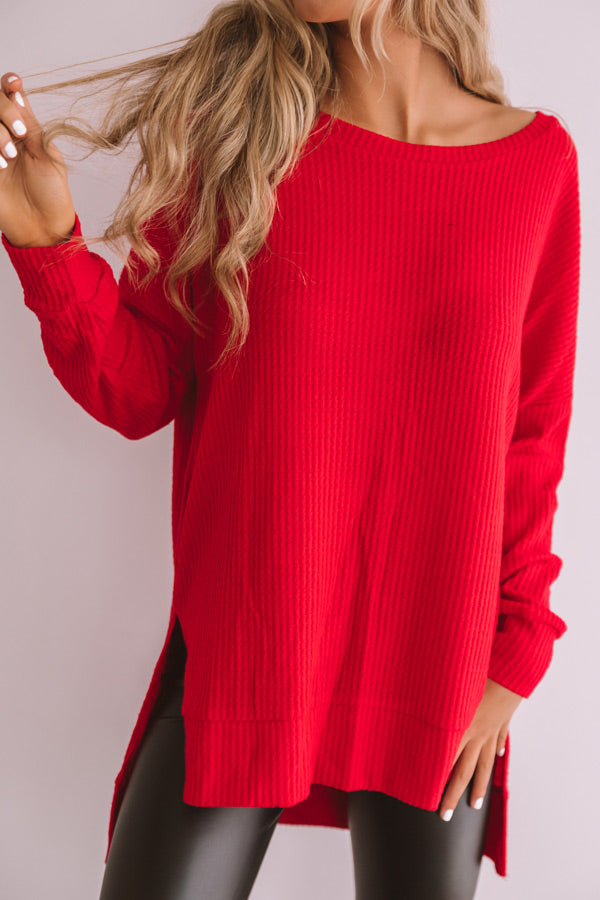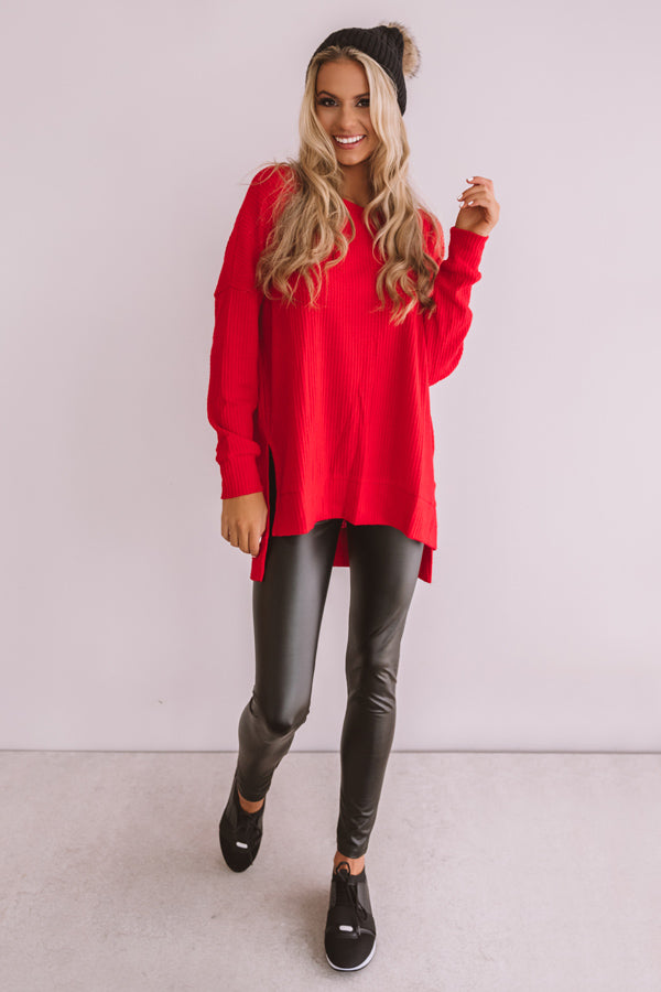 If you're "craving cozy," then this adorable red tunic top is the PERFECT piece for you with its lightweight waffle knit textured material, high rounded neckline, long loose sleeves with fitted cuffs, and a relaxed silhouette that falls into a straight high/low upper thigh length hemline with high side slits! We have dress this versatile piece down with some faux leather leggings, a plaid scarf, and a black sneaker, backpack, and beanie, but you can also wear it with some distressed ankle skinnies and our red "Keaton Faux Suede Ankle Bootie!" Measurements