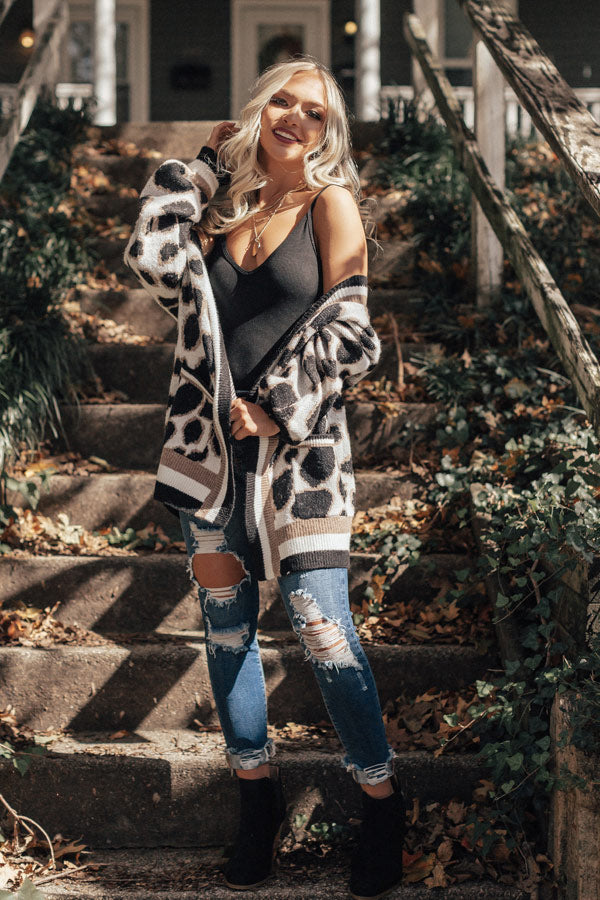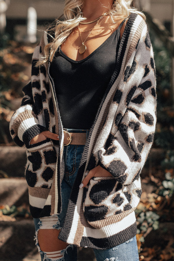 If you're "craving cuddles," then this cardigan is PERFECT for you with its soft lightweight tight knit material patterned with a bold black leopard print, long oversized sleeves with fitted cuffs, striped accent trim with ribbed texturing, low side pockets, and relaxed open front silhouette that falls into a straight mid-thigh length hemline! You can style this versatile piece with just about anything from a basic tank to a sweater, jeans to skirts or dresses, booties to wedges or sandals, clutches to totes, and hats to earrings!