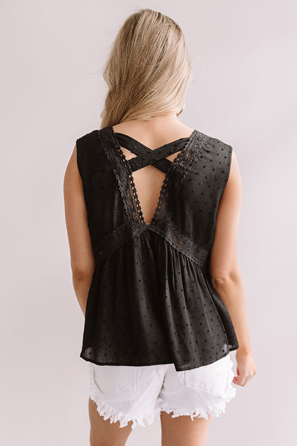 An ocean breeze puts the mind at ease, especially when you're wearing our elegant black "Craving The Coast" top featuring lightweight breezy material, intricate crochet detailing throughout, a deep v-cut neckline and upper back with a criss cross strap closure, wide shoulder straps, and a relaxed babydoll silhouette that falls into a straight hemline! We have styled this cutie with some frayed white shorts and black wedges, but you can also wear it layered under our "Insider Chic Camo Cardigan" with some distressed ankle skinnies, "The Brighton Espadrille in Grey," and a grey faux suede hat and tote! Measurements