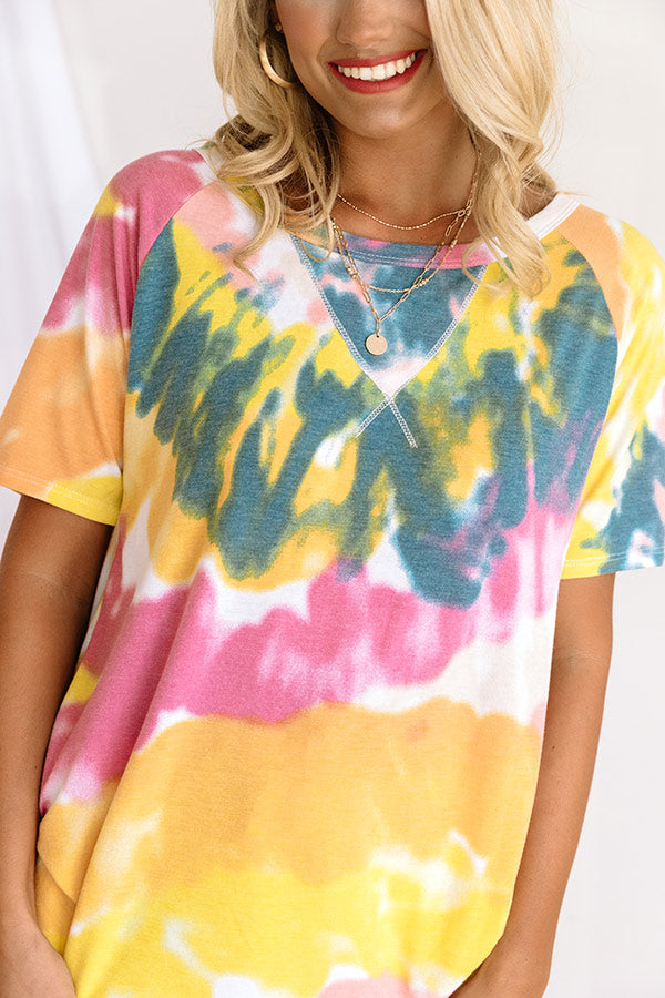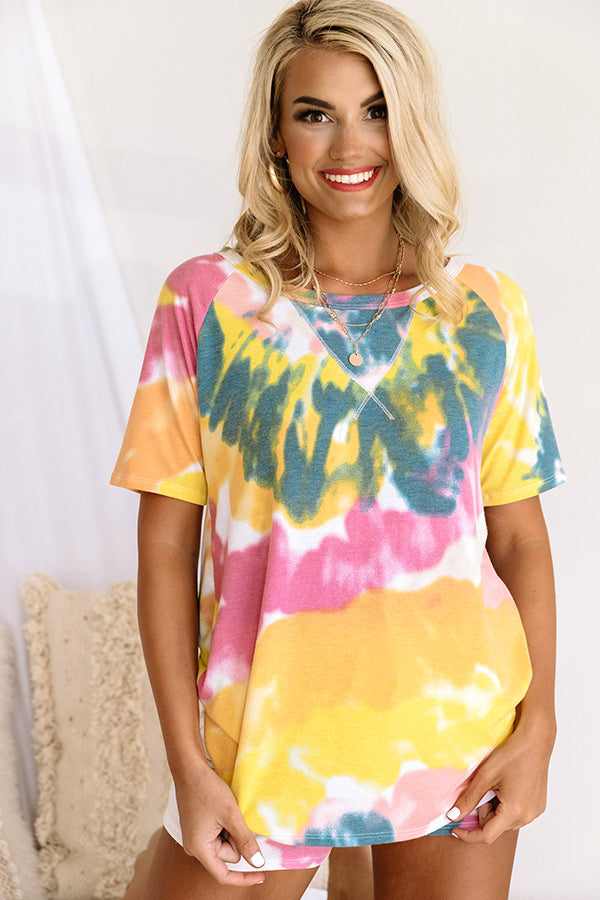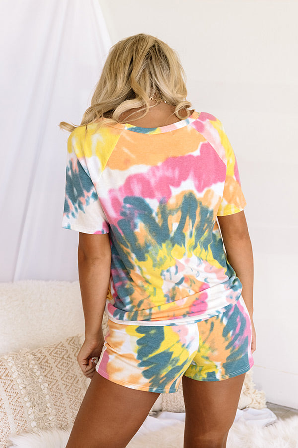 Relax in color with our adorable "Creative Flow" tee featuring ultra soft lightweight material patterned with orange, pink, and navy hued tie dye, a high rounded neckline, short loose sleeves, and a relaxed silhouette that falls into a rounded hemline! This comfy piece styles perfectly with our matching "Morning Routine Tie Dye Shorts in Orange," a scrunchie, and some fuzzy slippers for the ultimate two-piece lounge look!