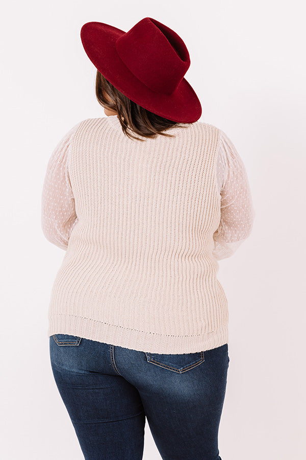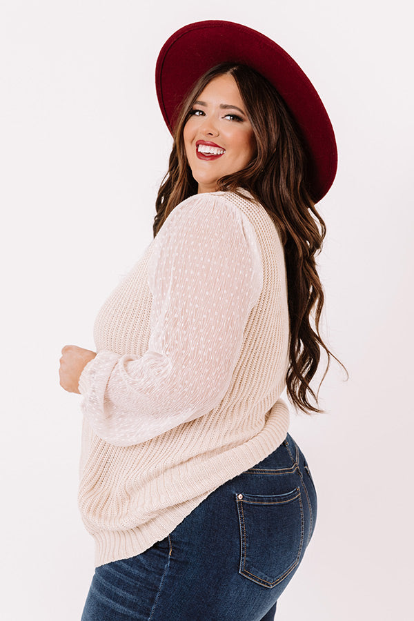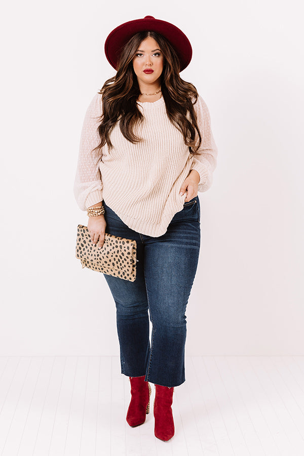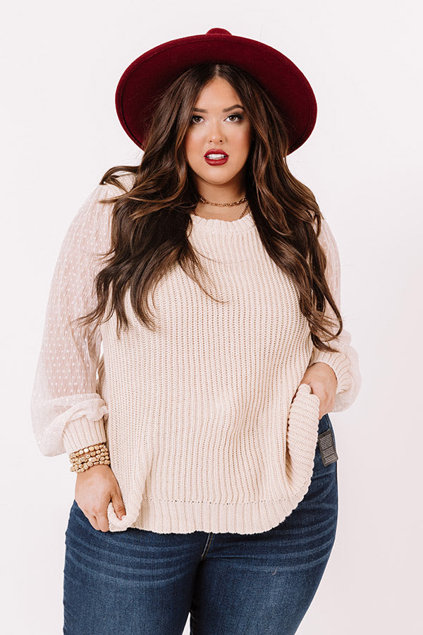 Plus Size - There is no better piece to take your from nine to wine in the fall than our chic cream colored "Crisp And Cool" sweater featuring a soft lightweight tight knit bodice with ribbed texturing, a high rounded neckline, long semi-sheer bubble sleeves with fitted cuffs and a polka dot pattern, and a flattering silhouette that falls into a straight hemline! Measurements