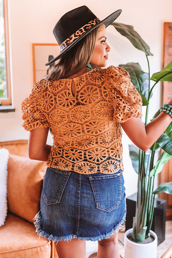 You will surely steal the show in our darling camel colored "Crochet On Sunday Top" featuring ultra lightweight semi-sheer crochet material with a sewn in tank top underneath, a high rounded neckline, short puff sleeves with elastic banded cuffs, a keyhole accented upper back with a button closure, and a figure flattering silhouette that falls into a scalloped hemline! This intricate piece styles perfectly with a denim skirt,turquoise statement jewelry, matching wedges, and a leopard statement belt and faux suede hat, but you can also wear it with some white flares and "The Lula Heel in Camel!" Measurements