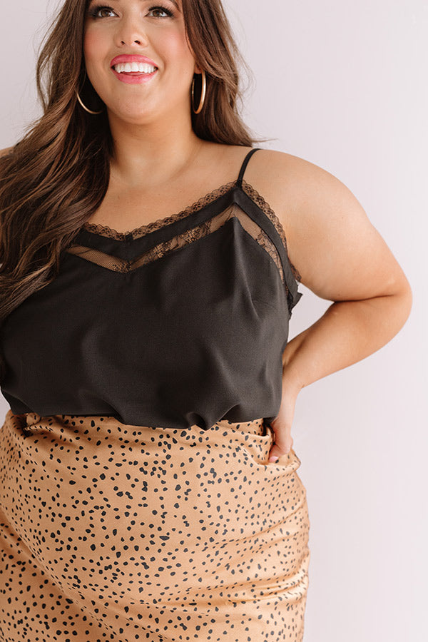 Plus Size - You will look beyond basic when you wear our black "Croissants And Kisses" tank featuring sleek lightweight satin material, a v-cut neckline, intricate lace detailing on the trim and around the bodice, adjustable spaghetti straps with a low open back, and a relaxed silhouette that falls into a straight hemline! We have styled this upscale cutie with a cheetah print skirt and a black simple heel and crossbody, but you can also wear it layered under our "Divine In Destin Knit Cardigan in Stone" with some distressed ankle skinnies, "The Brighton Espadrille in Stone," and our "Viva Vacay Clutch in Stone!"