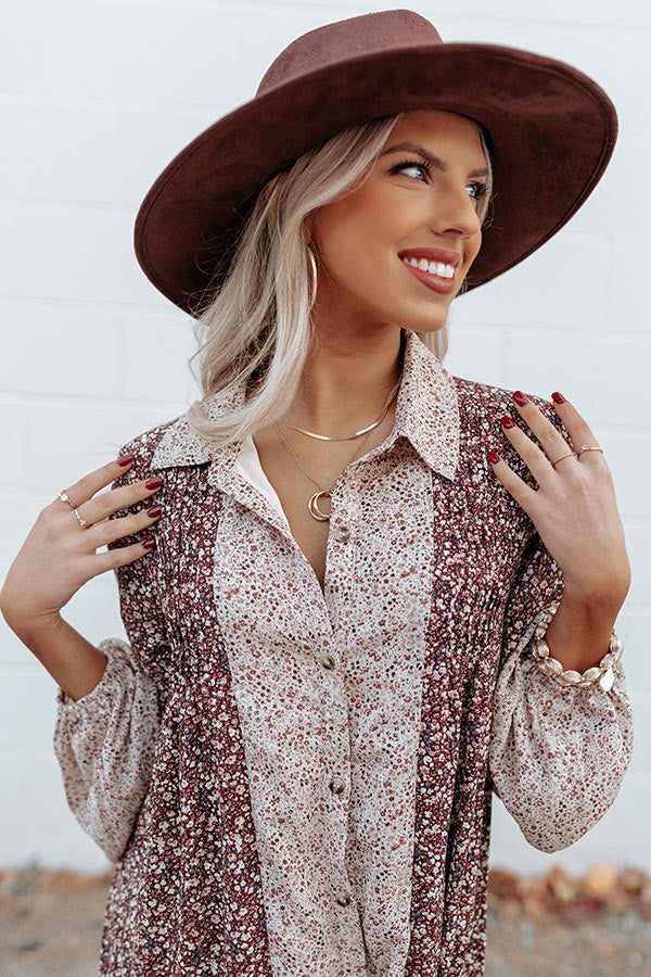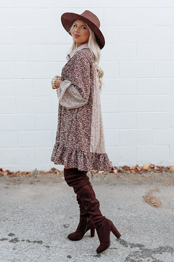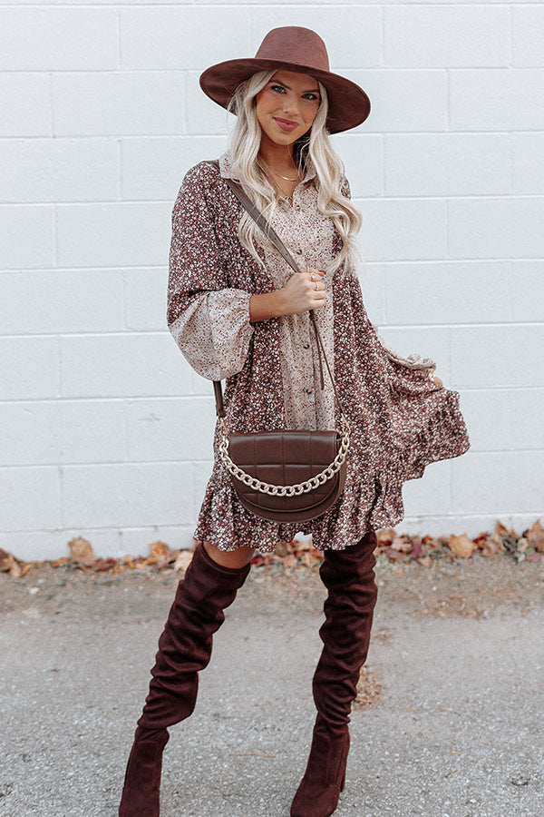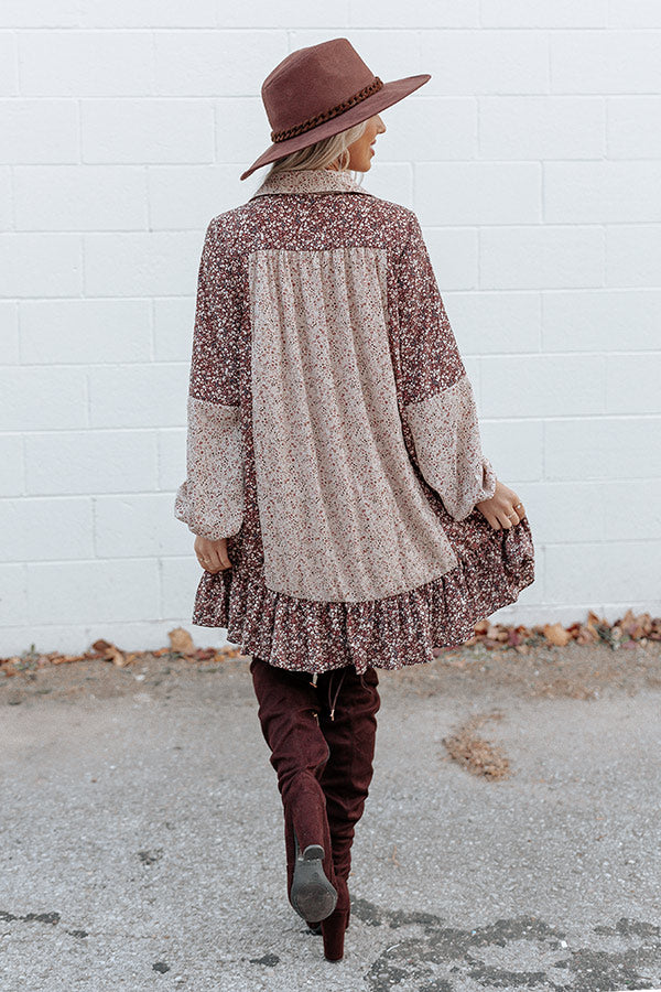 You are guaranteed to turn heads when you arrive in our beautiful 'Crowded Affair' shift dress featuring lightweight and flowy material brown and light taupe hued material patterned with a dainty floral print, a button down front with a collared neckline, long loose sleeves, and a relaxed silhouette that falls into a ruffled mid-thigh length hemline!