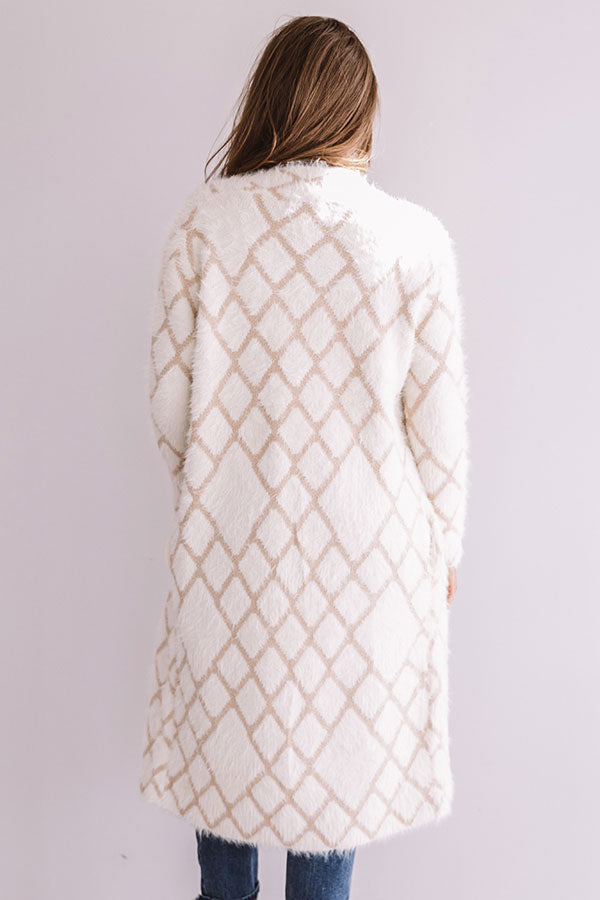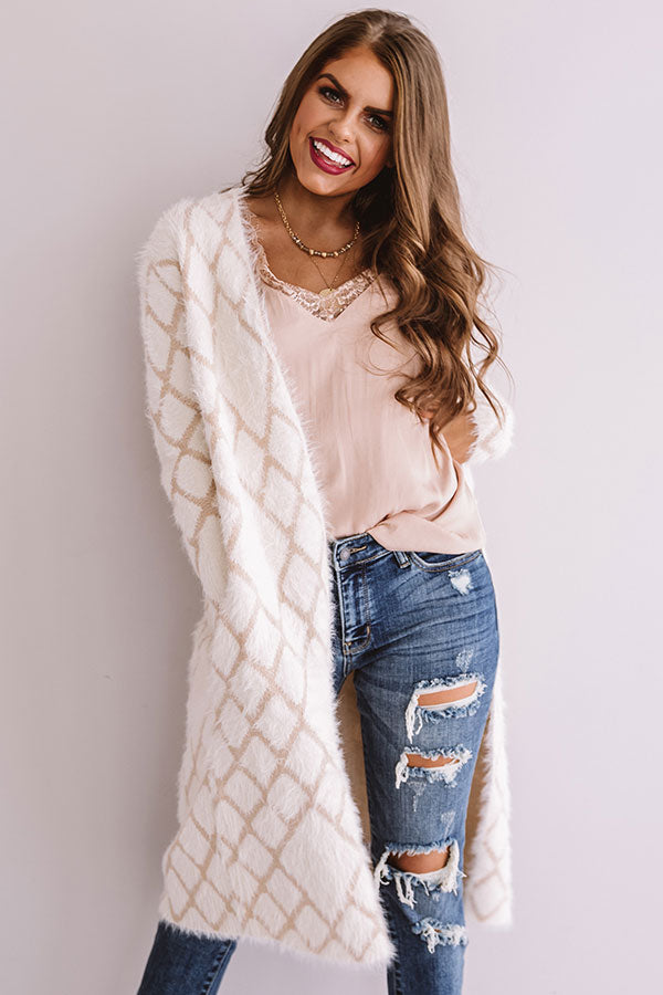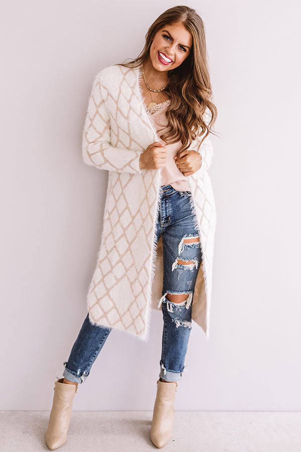 Nothing bring comfort to a gloomy day like a soft and cozy cardigan! Our white "Cuddles And Kisses" cardigan features ultra soft lightweight material with fuzzy texturing, a neutral hued diamond pattern, long semi-loose sleeves, hidden side pockets, and a relaxed open front silhouette that falls into a straight knee-length hemline! You can wear this versatile piece with just about anything from a basic tank to a sweater, jeans to skirts or dresses, booties to wedges or sandals, clutches to totes, and hats to earrings!