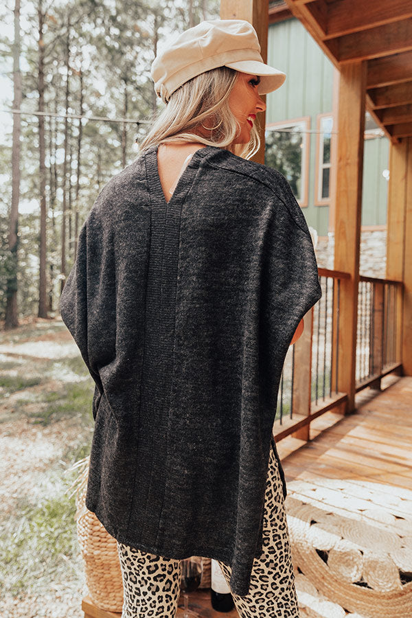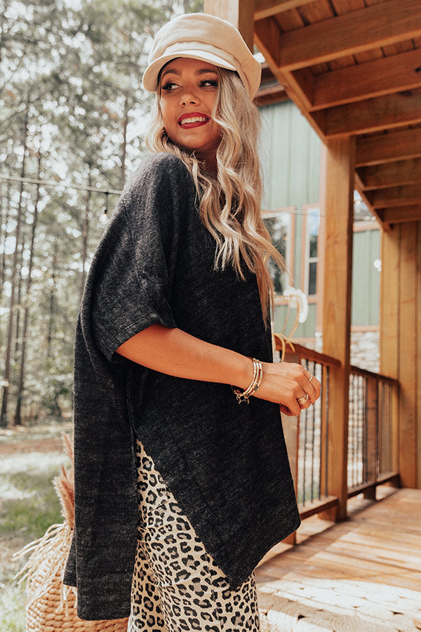 Cuddle up in our gorgeous black "Cuddles At The Lodge Shift Tunic" featuring lightweight flowy material, a v-cut neckline and upper back with ribbed trim detailing, oversized half sleeves, and an ultra draped silhouette that falls into a straight upper-thigh length hemline with accent side slits!