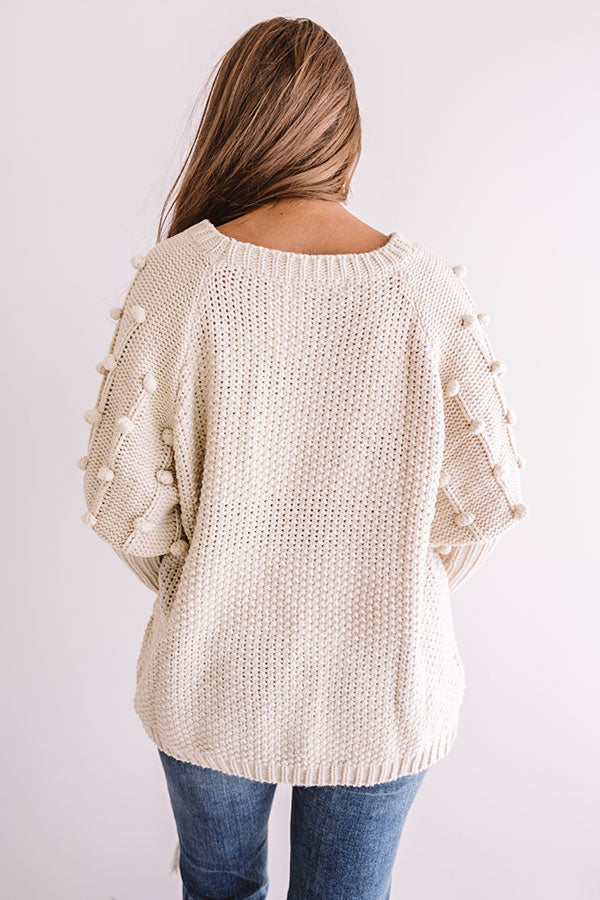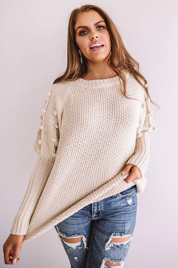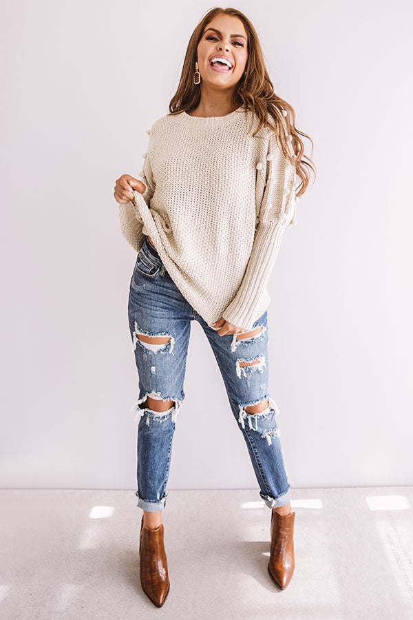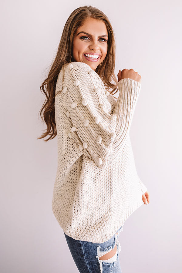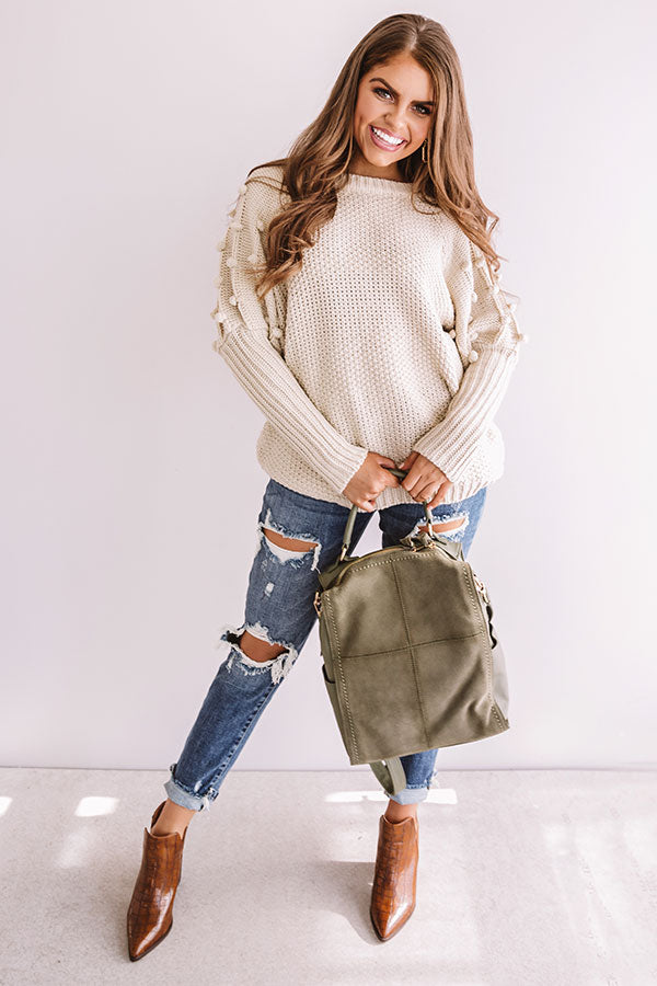Stay warm while staying stylish with our stone colored "Cuddles Divine" sweater featuring soft lightweight tight knit material with a waffle knit textured bodice, a high rounded neckline, long loose sleeves with ribbed form fitting forearm cuffs and oversized upper arms with large polka dot accents, and a relaxed silhouette that falls into a straight tunic length hemline! This cold weather essential styles beautifully with some distressed ankle skinnies, brown booties, and an olive backpack, or with some charcoal flares, "The Seraphina Faux Leather Wedge in Grey," and our "Bold Ambition Hat in Grey!" Measurements