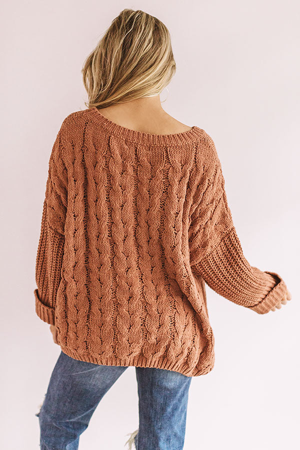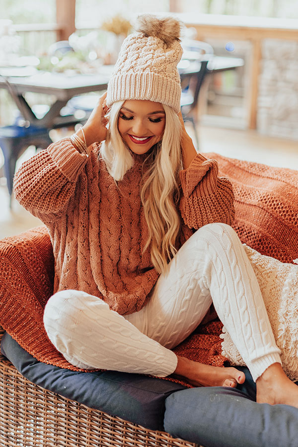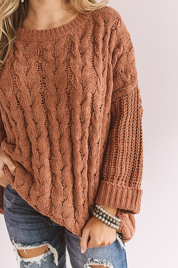 Cozy up for fall in our camel colored "Cuddles Forever" sweater featuring soft lightweight tight cable knit material with large braided texturing, a high rounded neckline, long oversized sleeves with fitted cuffs, and a relaxed silhouette that falls into a rounded hemline! Measurements