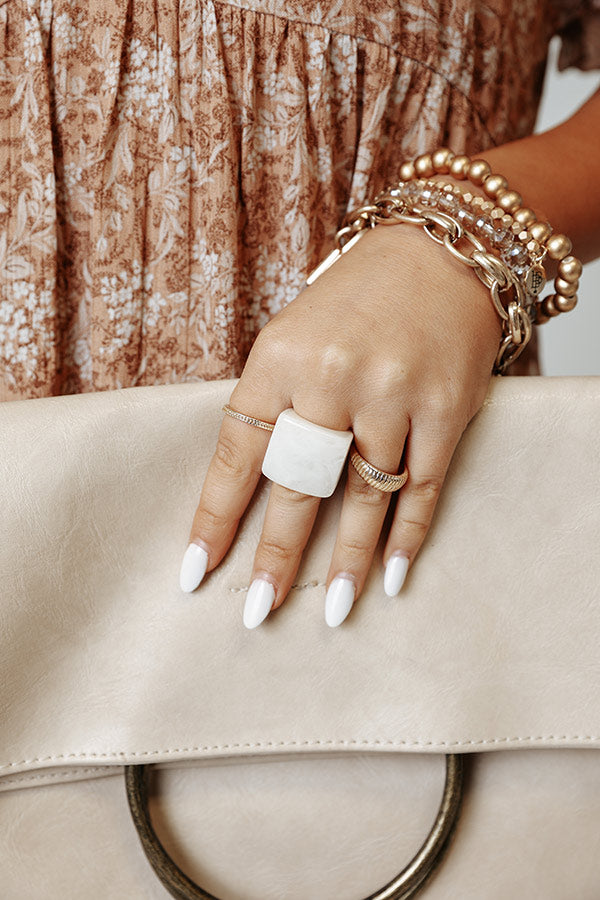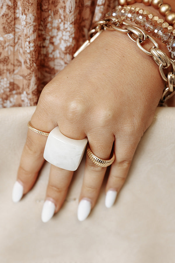 Keep calm and stylish by accessorizing with this trendy ring featuring a large white resin square!