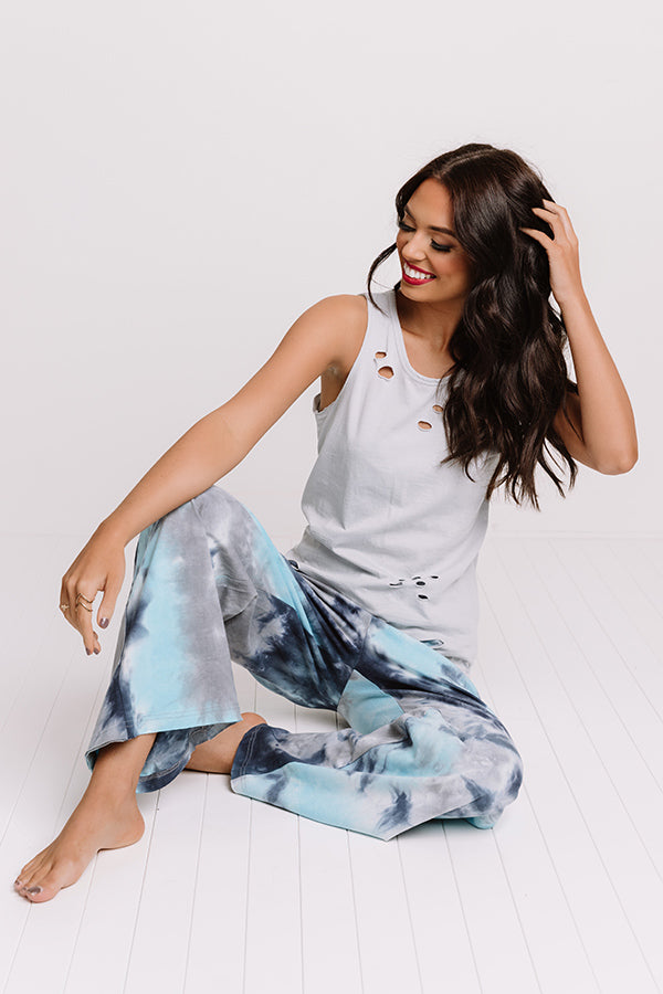 "Cue the cozy" with these trendy pants! They feature ultra soft lightweight material patterned with blue hued tie dye, a wide elastic waistline with a tie belt, and a relaxed silhouette that falls into straight floor-length hemlines!