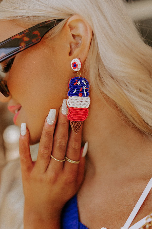 Cue the sparklers...summer is here and we have the perfect accessory for you! These cuties feature a beaded circle stud and a dangling red, white, and blue ice cream cone with sprinkles!