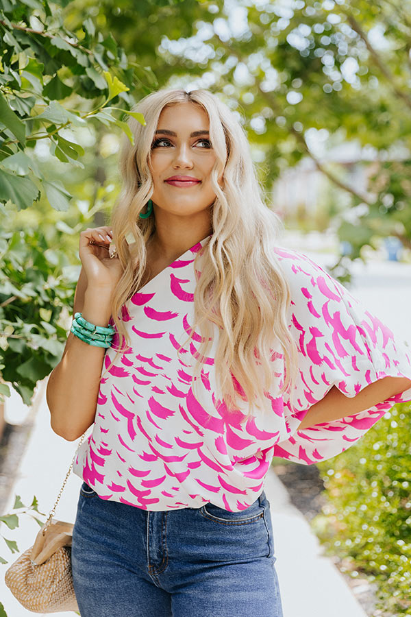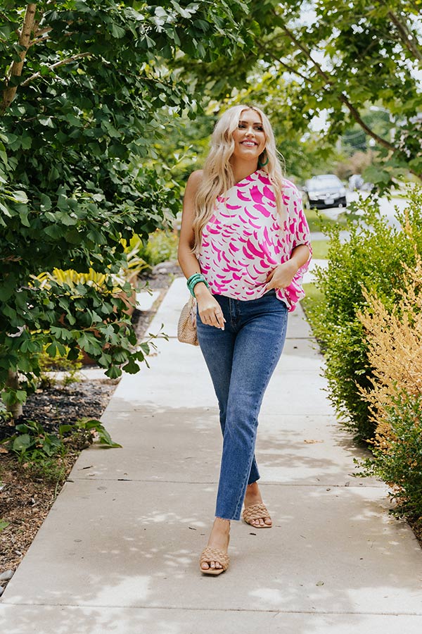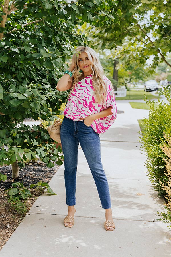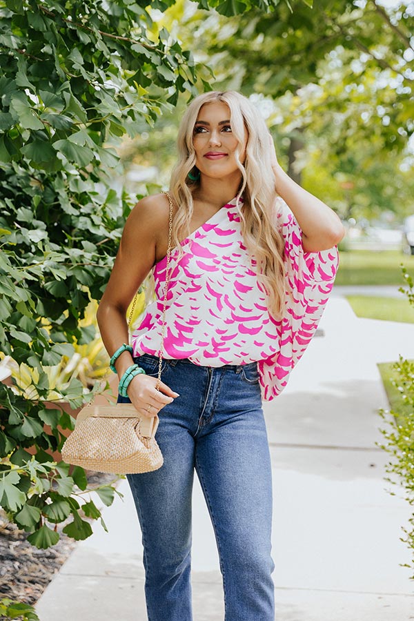 You will look like an absolute cutie when you complete your look with this adorable white shift top featuring lightweight material patterned with an abstract hot pink crescent print, a diagonal neckline and upper back with a single bat wing half sleeve, and a slouched silhouette that ends in a straight elastic hemline!