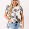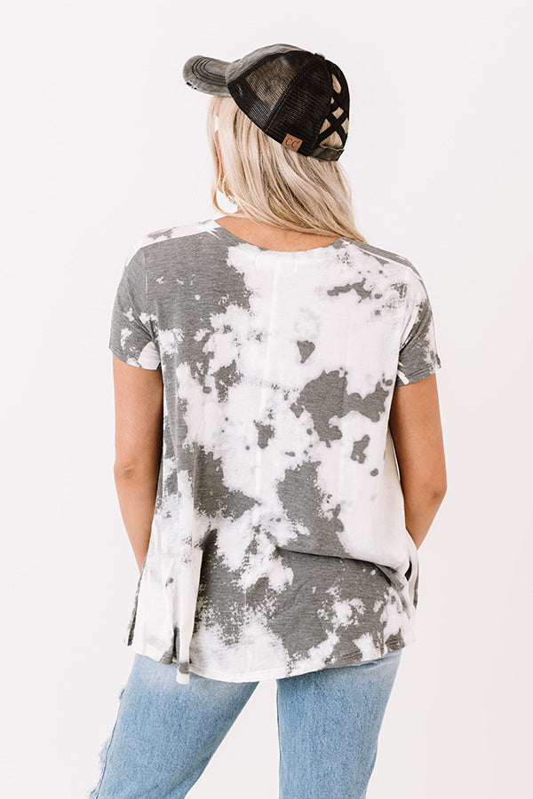 Showcase your curated style with this gorgeous top featuring lightweight material patterned with dark grey and white tie dye, a high rounded neckline, short loose sleeves, and a relaxed silhouette that ends in an uneven hemline!