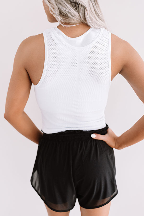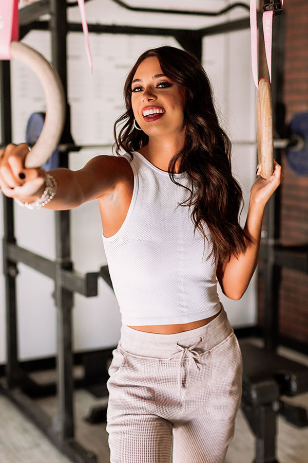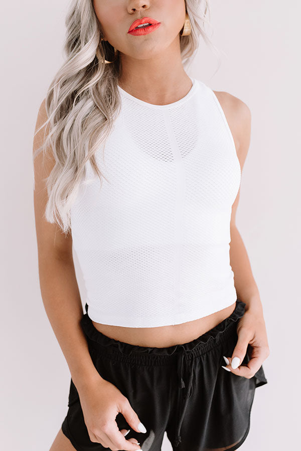 Keep it simple in our casual white 'Cut It Out' top featuring soft lightweight material with subtle tight mesh texturing, a high rounded neckline, 1-inch sleeveless shoulder straps with a racerback fit, and a form fitting silhouette that falls into a straight cropped hemline!