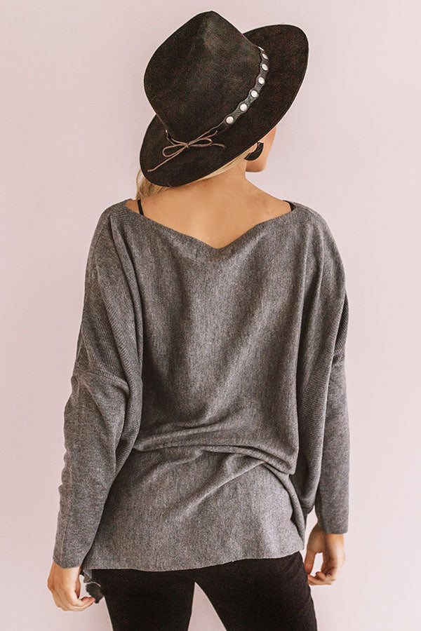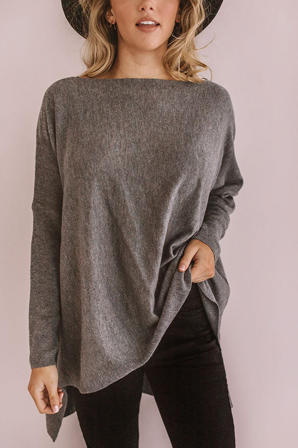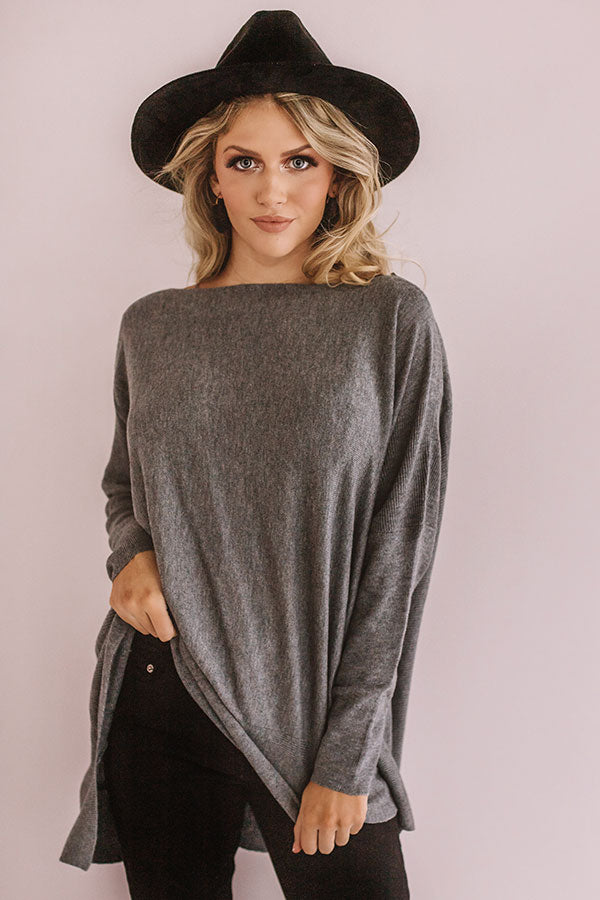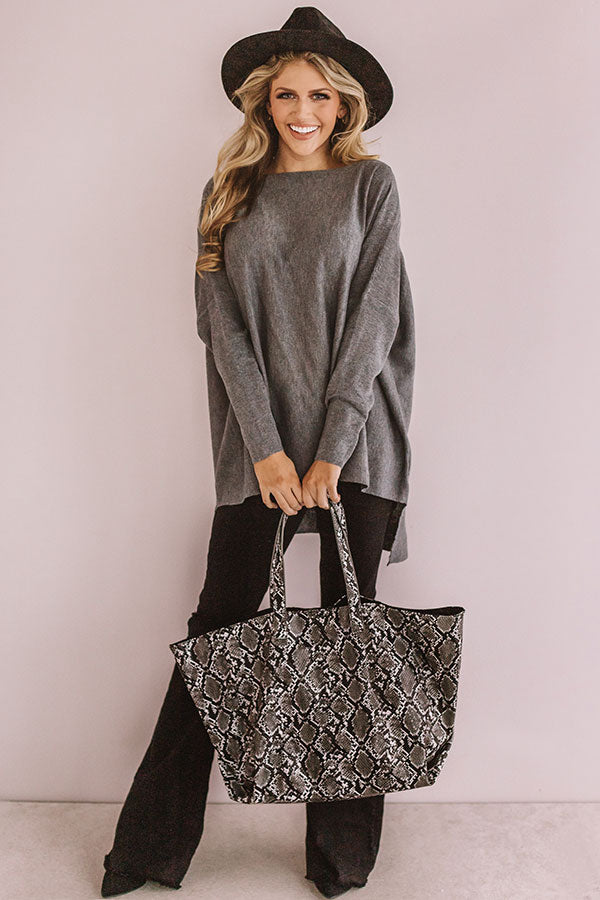 Our grey "Cute And Capable Shift Top" is the perfect year round wear anywhere piece with its soft lightweight tight knit material with subtle ribbed texturing, a wide rounded neckline that can be worn off one shoulder, semi-fitted 3/4-length PIKO sleeves, and a relaxed silhouette that falls into a straight high/low tunic length hemline! We have styled this adorable transitional piece with some flares, a snake print tote, and a black bootie and faux suede hat, but you can also wear it with some distressed ankle skinnies and "The Seraphina Faux Leather Wedge in Grey!" Measurements