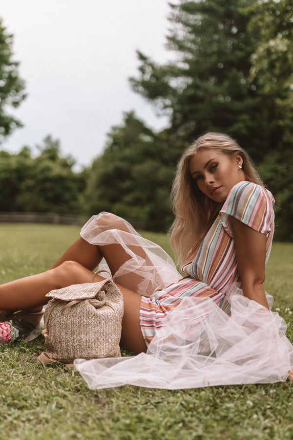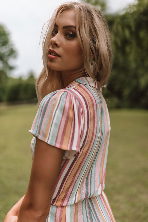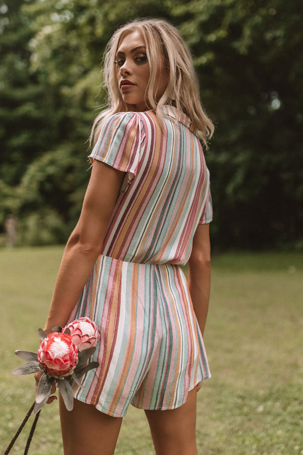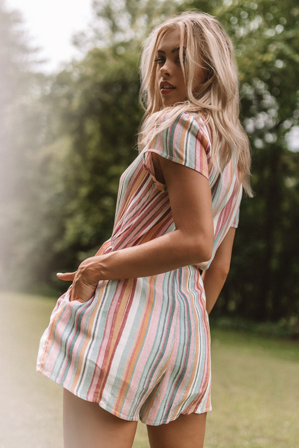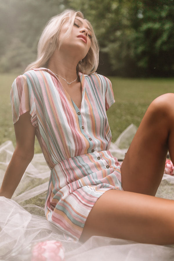 In a word full of changing trends, remain classic in this cute by design romper with its collar, pink stripes, and buttons down the front! Pair with some neutral wedges and a cool backpack for a trendy and exceptional summer look! Measurements