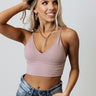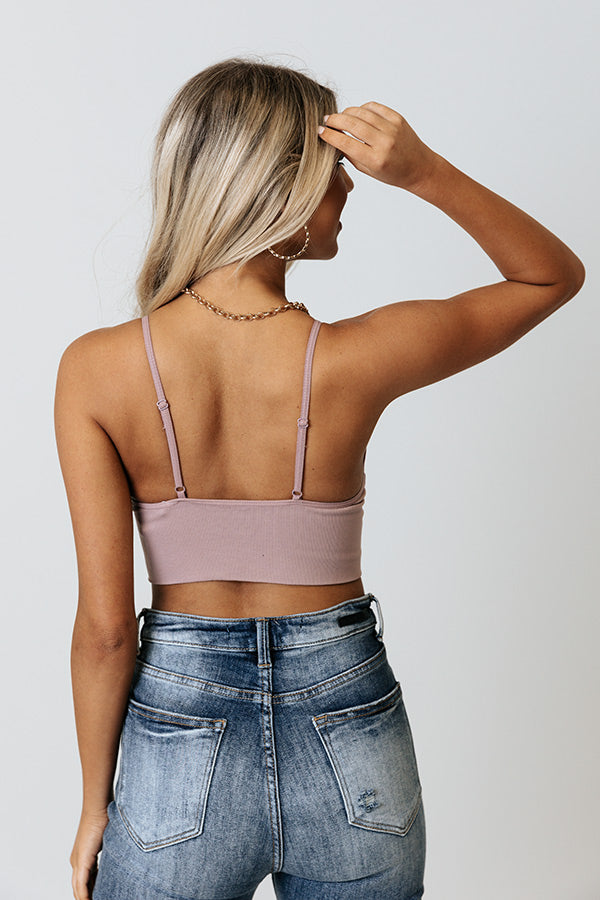Add a flirty and cute finish to your look with this trendy dusty purple colored bralette featuring soft four-way stretch material with subtle ribbed texturing, a triangle but bodice with a v-cut neckline, adjustable spaghetti straps, and a wide waistline that ends in a straight long line hemline! Measurements