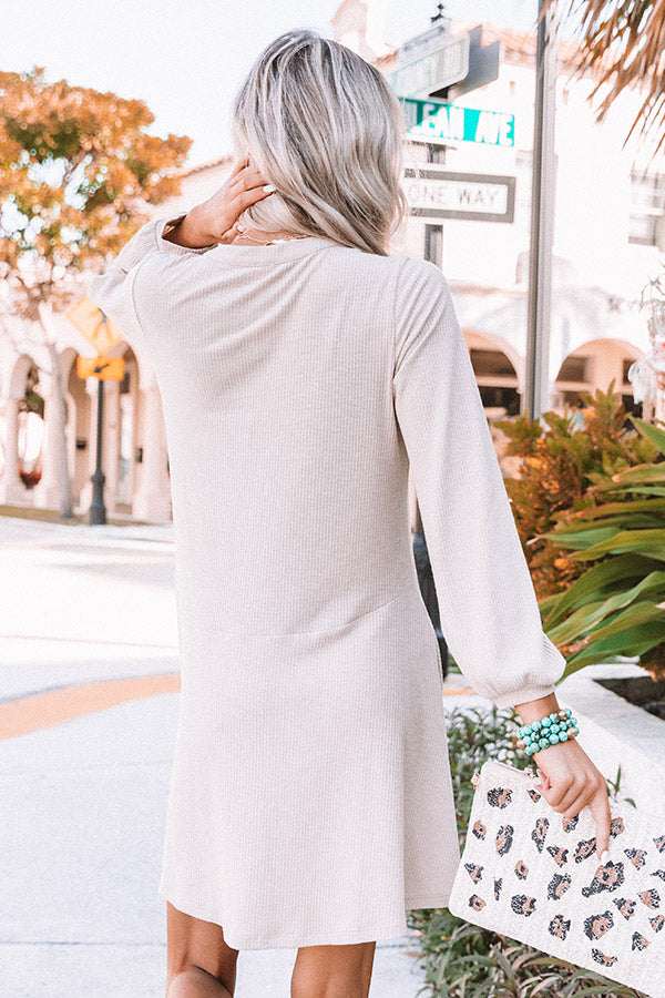You will surely be in a cute mood when you arrive this adorable birch colored shift dress featuring soft lightweight and flowy material with subtle vertical ribbed detailing, long loose sleeves, a button up bodice with a rounded neckline, accent side pockets, and a relaxed silhouette that falls into a straight mid-thigh length hemline! Measurements
