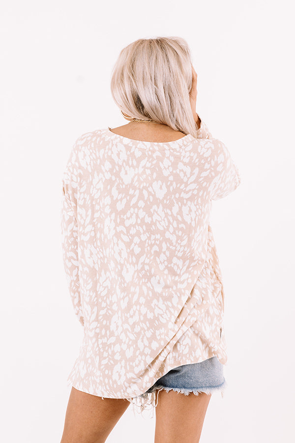 Feel cute in this adorable iced latte colored shift top featuring soft lightweight material patterned with a unique white spotted print, a high rounded neckline, long loose sleeves, and a slouched silhouette that ends in a straight hemline with accent side slits!