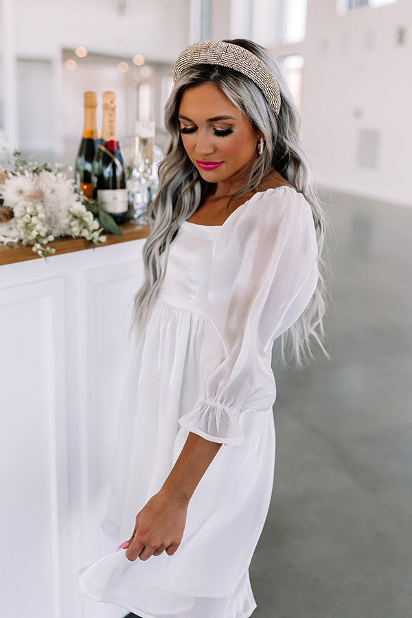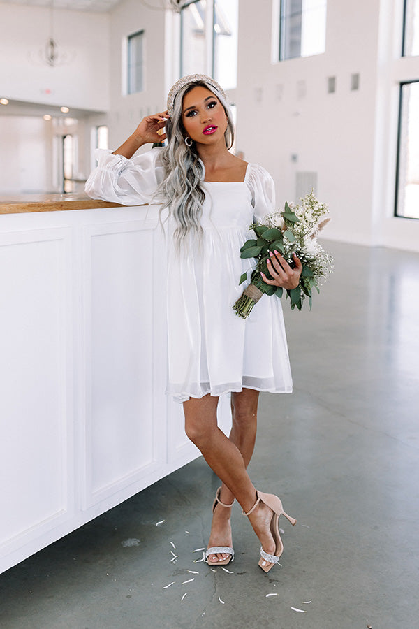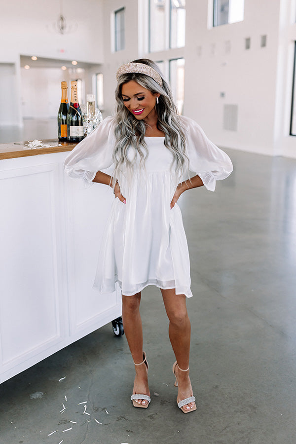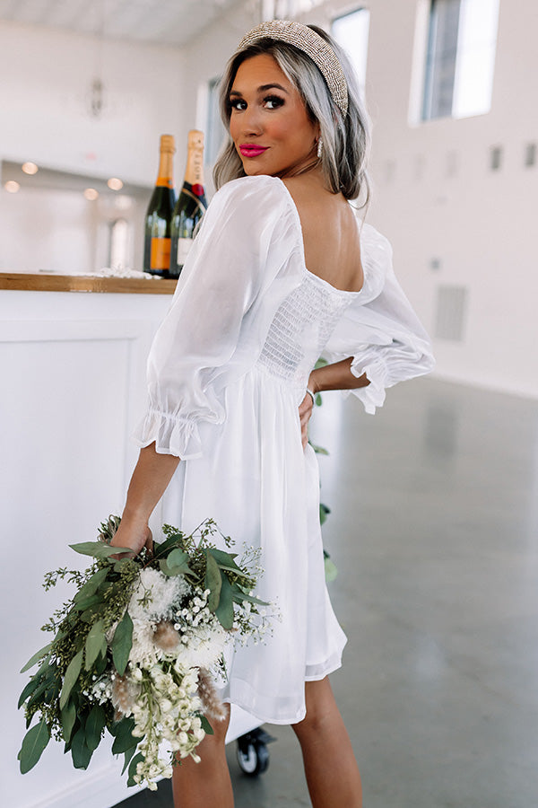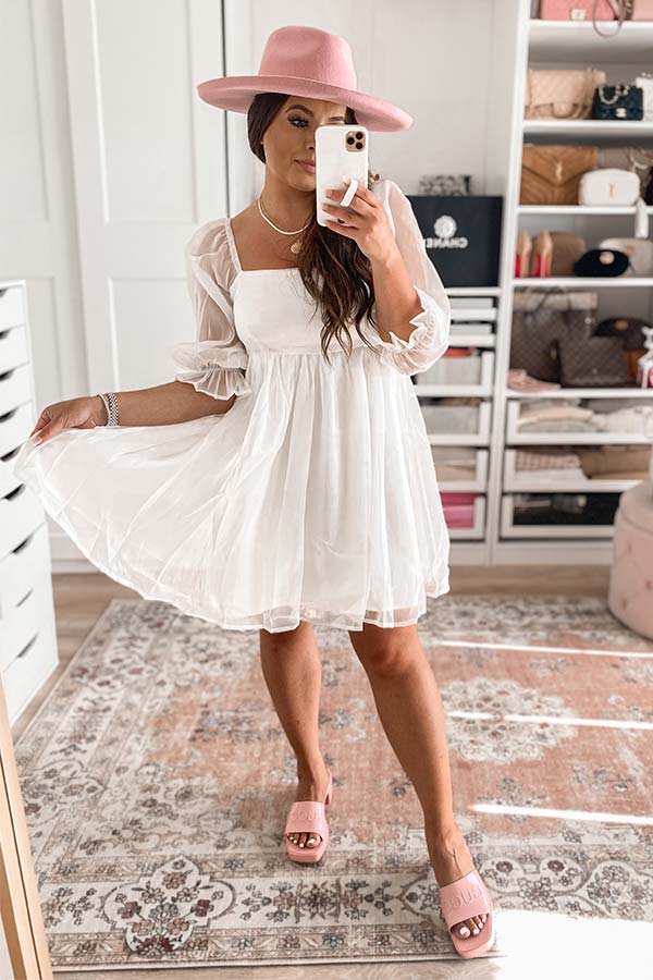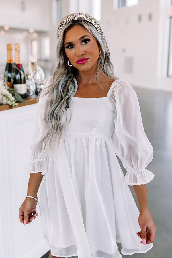 Twirl into style with our charming white 'Daily Devotion' dress featuring lightweight shiny material, a square neckline and upper back, smocked detailing in the back, semi-sheer 3/4-length bishop sleeves with subtle puff shoulders and flared cuffs, and a relaxed babydoll silhouette that falls into a straight mid-thigh length hemline!