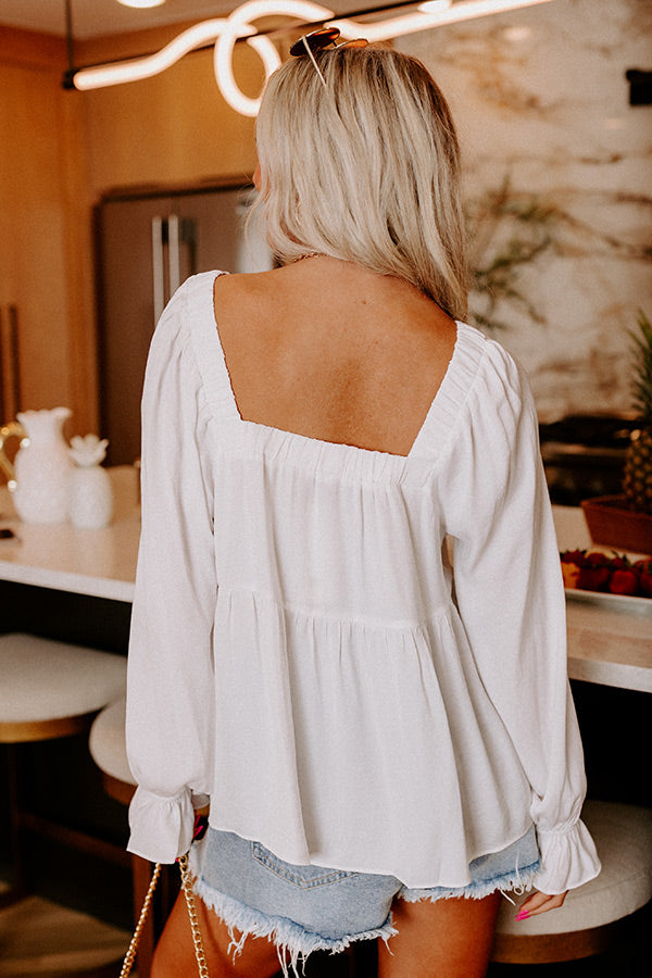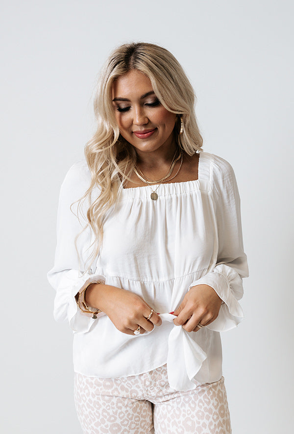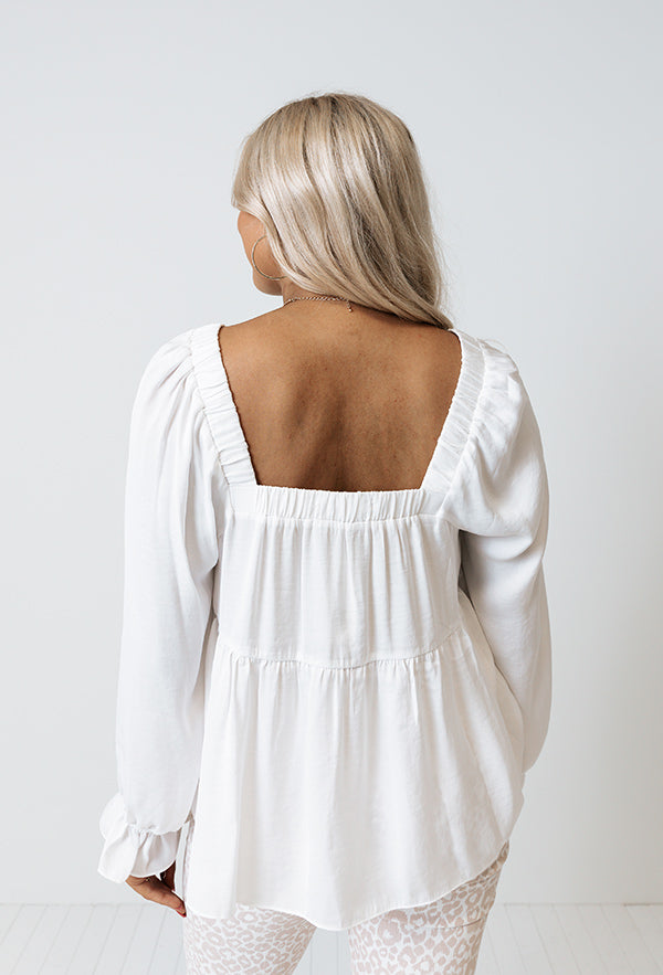 This is your daily reminder that you deserve some new clothes and we have the perfect piece for you! This darling white shift top features sleek lightweight material, a square neckline and upper back, long bishop sleeves with flared cuffs, and a relaxed but flattering tiered silhouette that falls into a straight hemline!