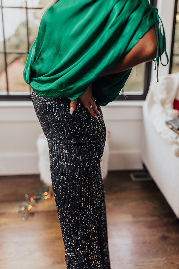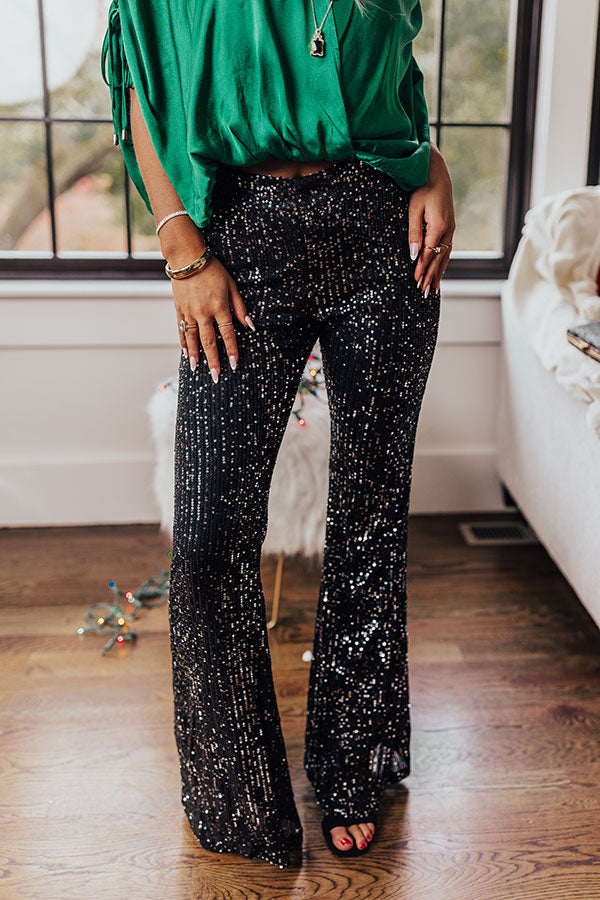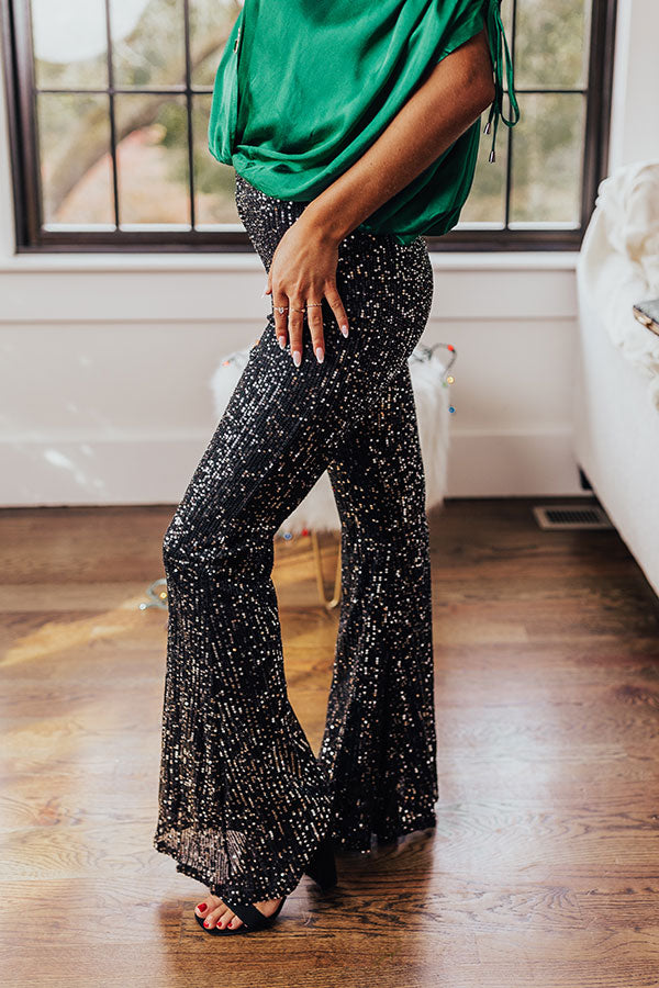 There is no better way to channel a dainty glam vibe with your OOTD than with these gorgeous black 2-tone bottoms featuring lightweight material covered in shimmering black and silver sequins, a hidden zip closure, and a fitted silhouette that falls into flared floor length bottoms with straight hemlines! PLUS, these cuties come with slip shorts underneath! Measurements