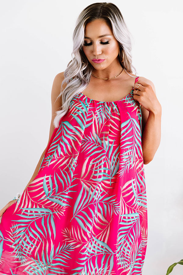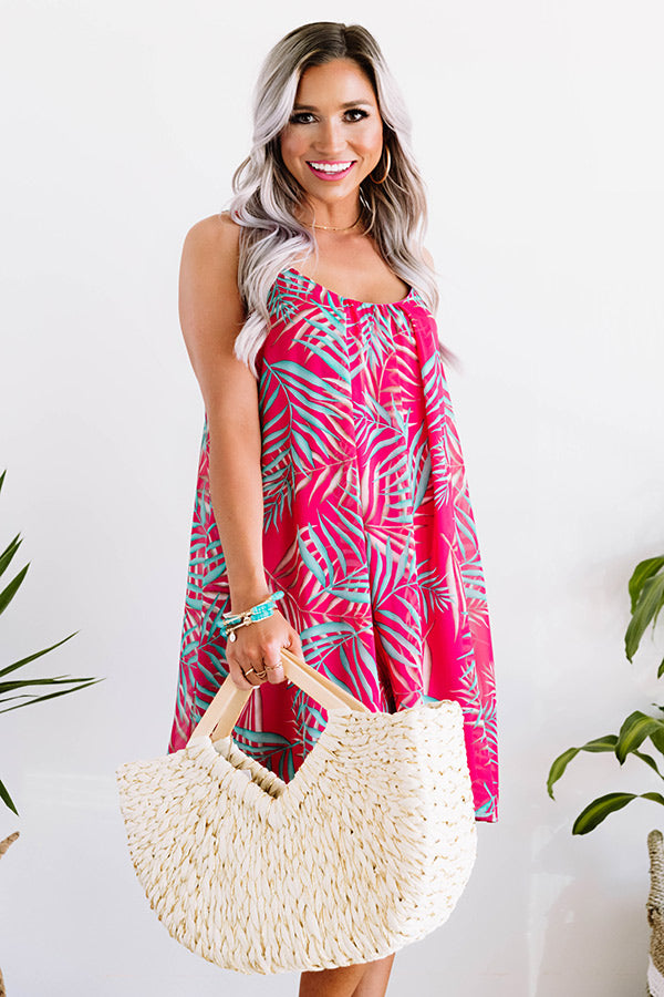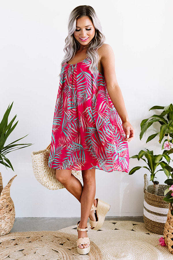 Get beach vacay ready in our stunning hot pink "Daiquiris And Daydreams" shift dress featuring lightweight breezy material patterned with a light blue floral palm leaf print, a scooped neckline, skinny sleeveless shoulder straps with a low back, and an ultra relaxed silhouette that falls into an uneven lower-thigh length hemline! We have styled this tropical cutie with some neutral stud wedges and a woven tote, but you can also wear it with "The Melina Faux Suede Heel in Mint" and our "Real Talk Embellished Headband in Fuchsia!" Measurements