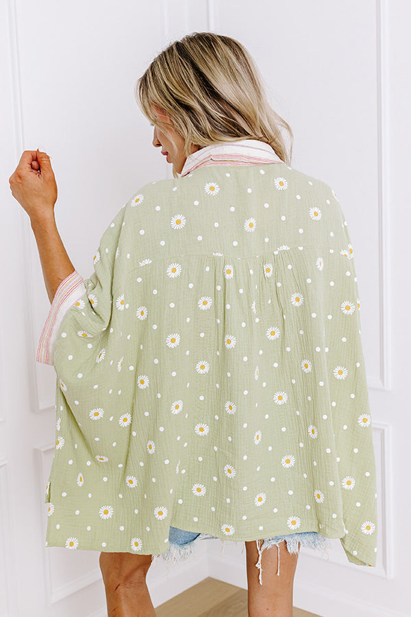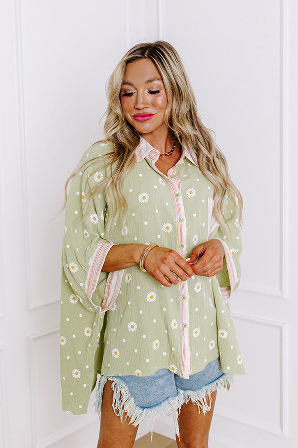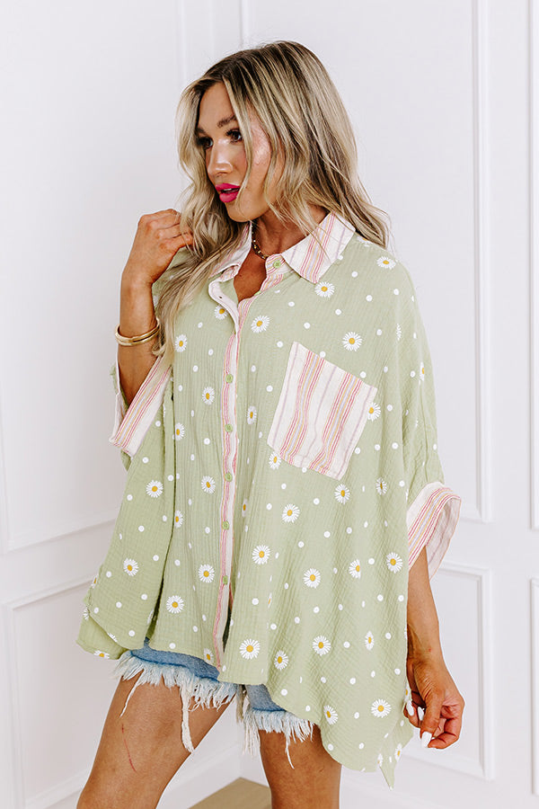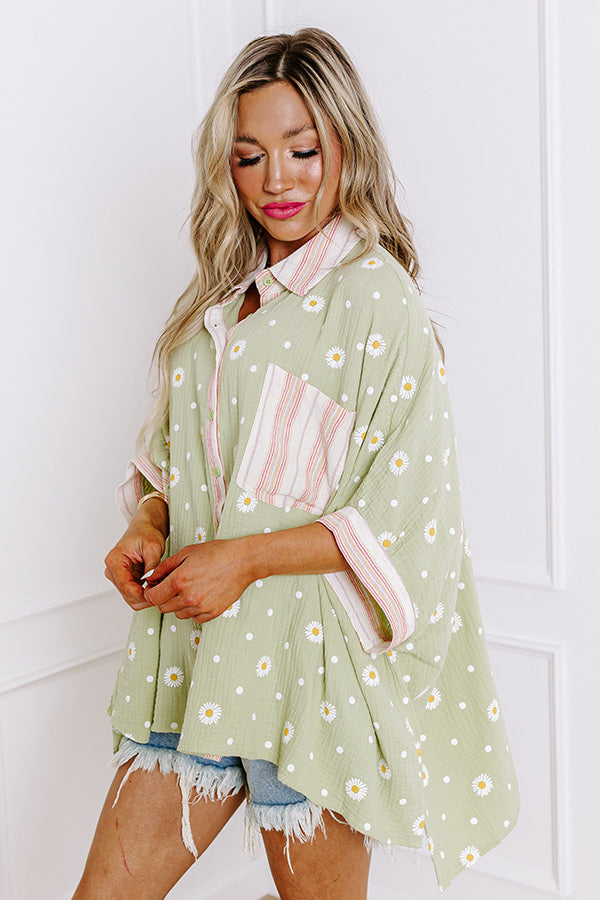 - Celebrate whimsical charm with this oversized collared button-up top! With a delightful daisy and dot pattern, a breezy fit, and playful design make it a perfect addition to your wardrobe, effortlessly blending comfort with a sweet vibe. Pair it with your favorite shorts or jeans for a casual-cute look. Its sweet design is sure to set the mood for an easy-going day.