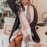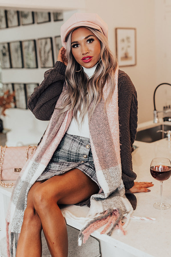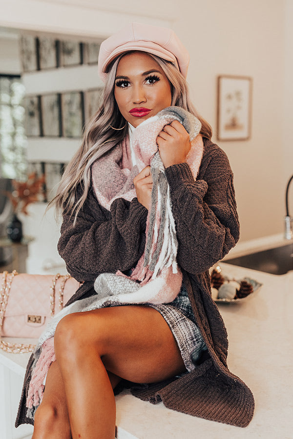 Stay wrapped in warmth with our darling 'Dakota Views Scarf' featuring soft knit material patterned with a large blush, white, and grey plaid print and long fringe trim detailing!