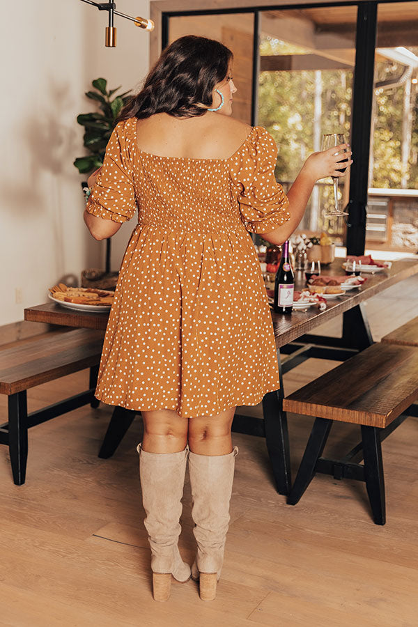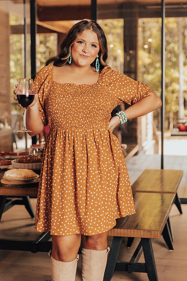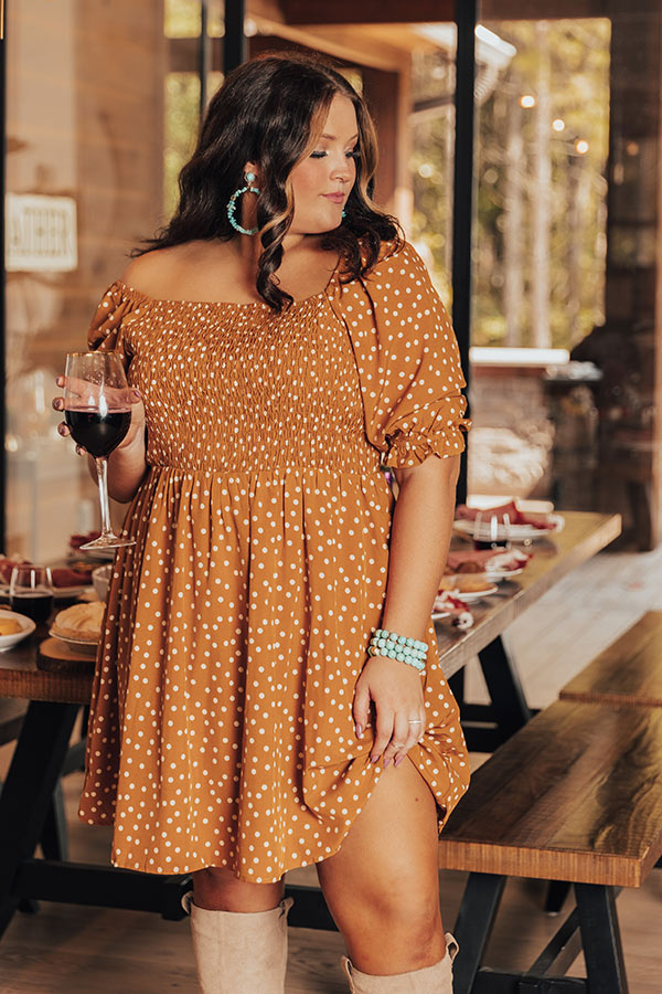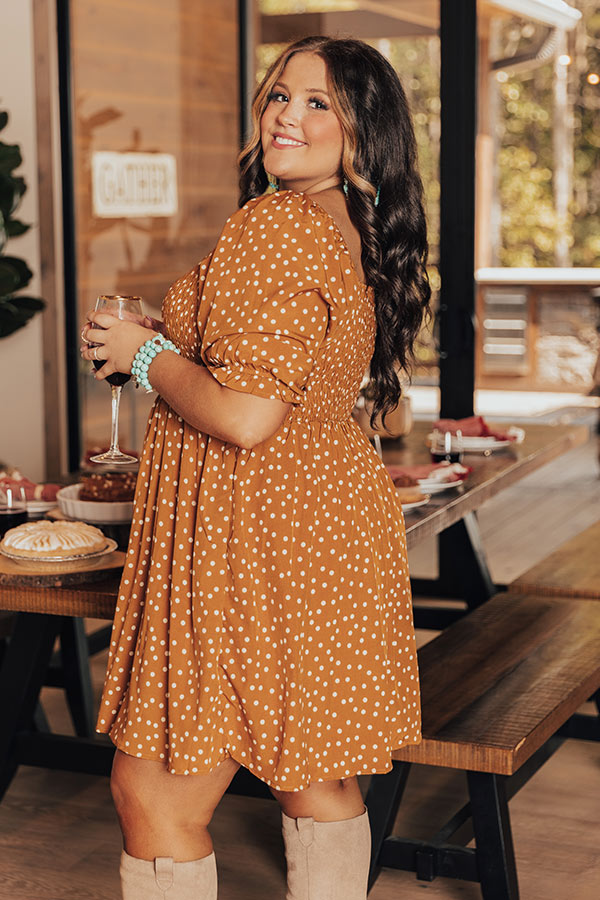 Dance to the beat of your own tune and dream big in this darling plus size pumpkin hued dress featuring lightweight flowy material patterned with white polka dots, a fitted smocked bodice with a scooped neckline and upper back, loose half sleeves with elastic band cuffs, and a relaxed skirt silhouette that falls into a straight mid-thigh length hemline! Measurements