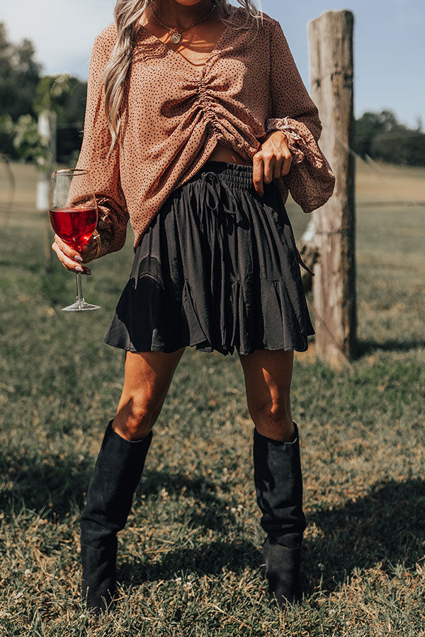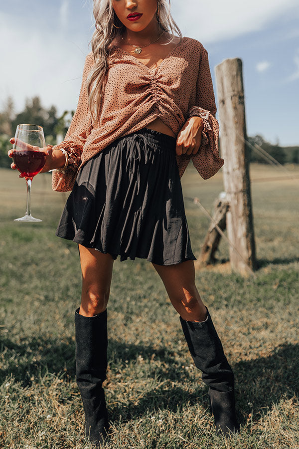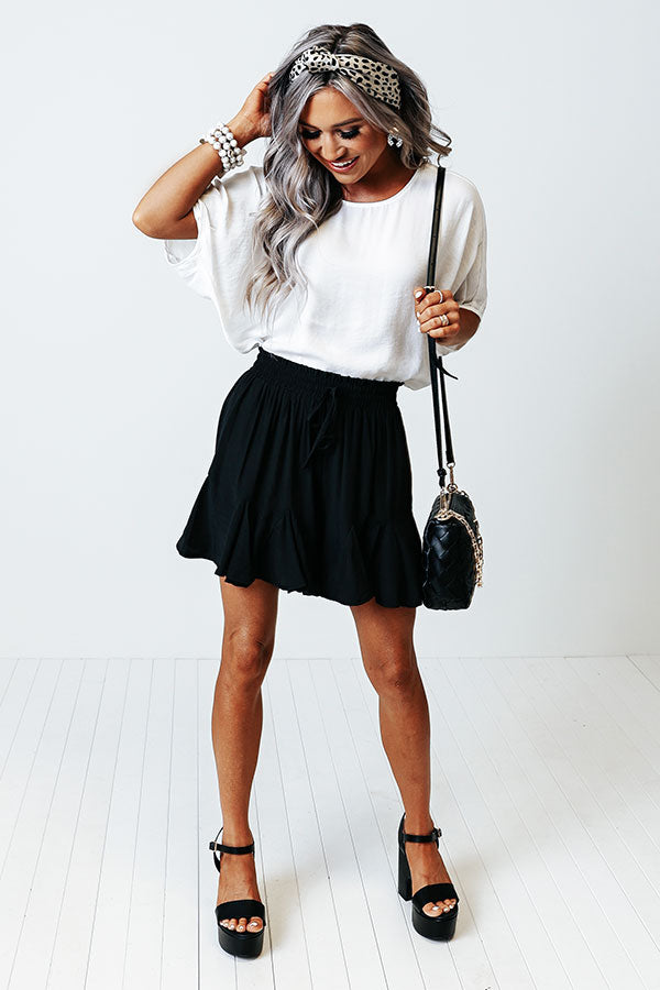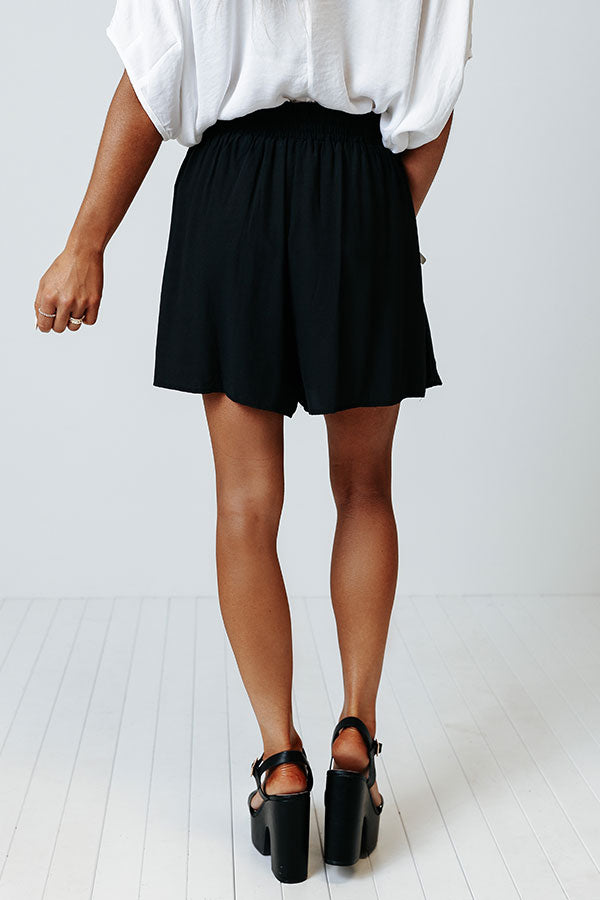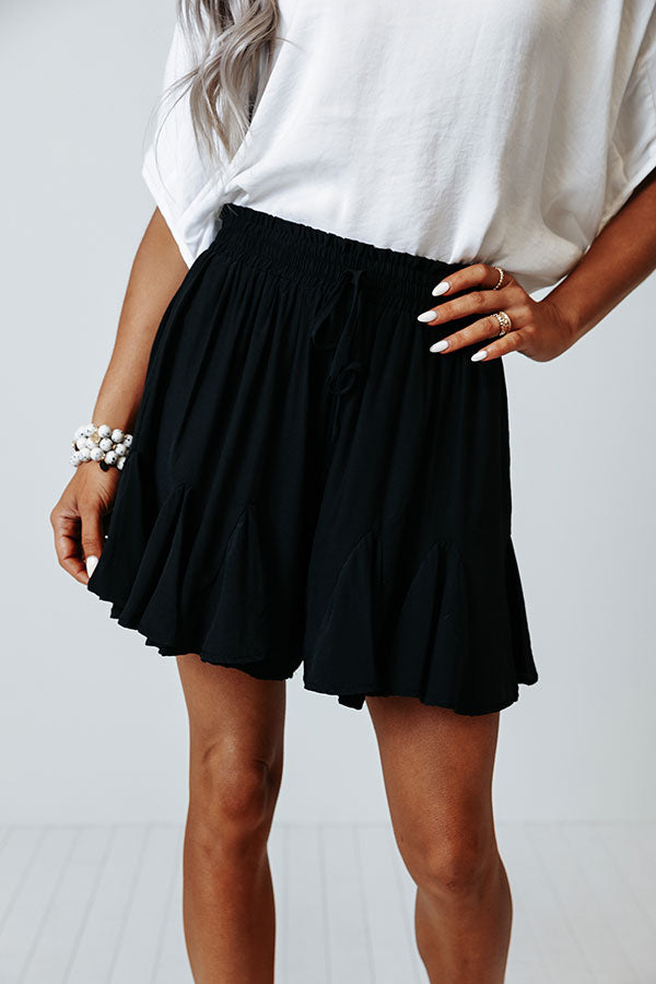 Dance to the beat of your own tune with these flirty black shorts featuring lightweight flowy material, a smocked waistline with a tie closure, and a relaxed but flattering silhouette that ends in ruffled upper-thigh length hemlines! Measurements