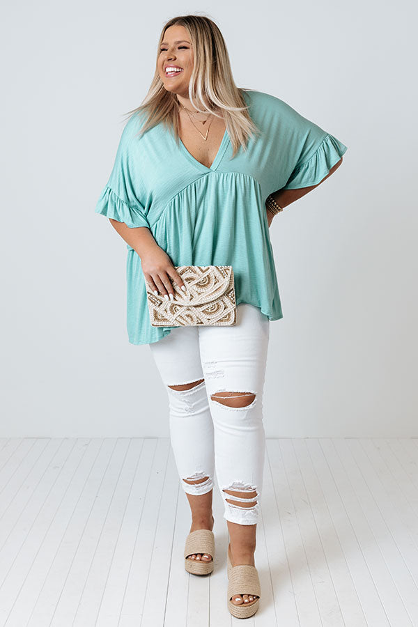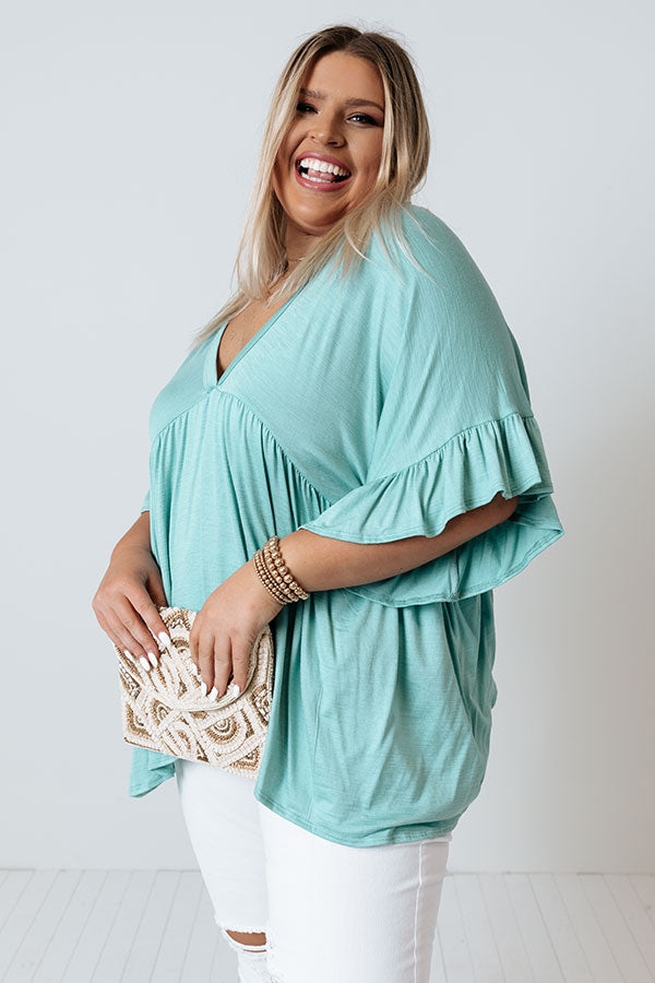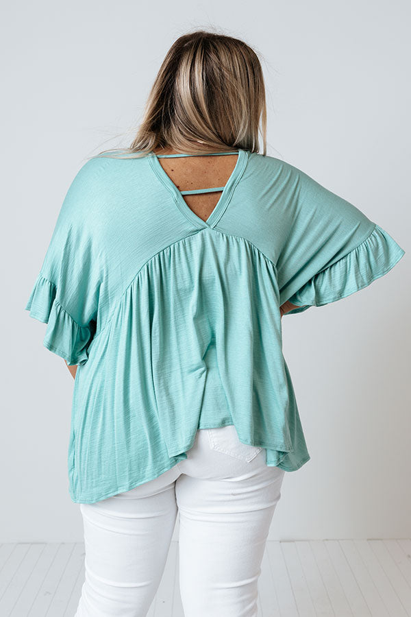 Plus Size - Dance into summer looking adorable in this cute aqua hued top featuring lightweight breezy material, a v-cut neckline and upper back with a two strap closure, short loose sleeves with ruffled trim detailing, and a relaxed babydoll silhouette that falls into an uneven hemline! Measurements