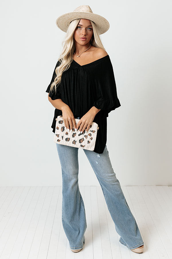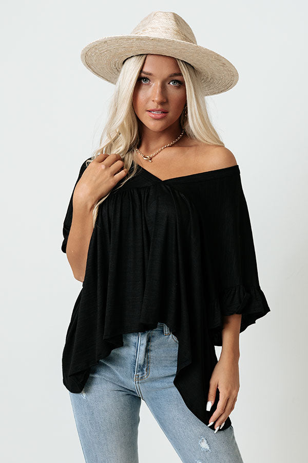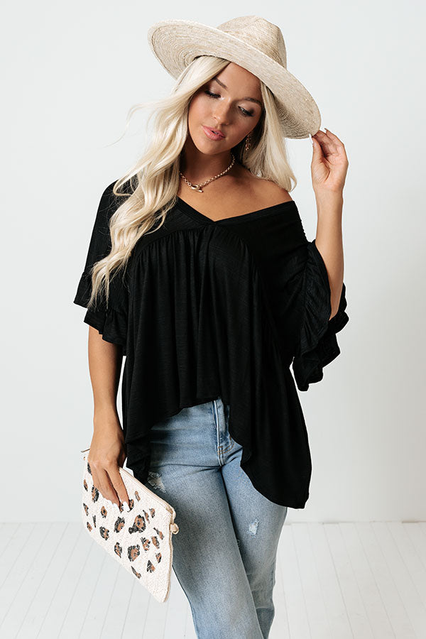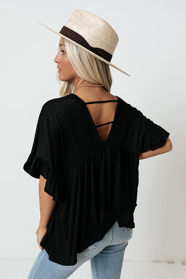 Dance into summer looking adorable in this cute black top featuring lightweight breezy material, a v-cut neckline and upper back with a two strap closure, short loose sleeves with ruffled trim detailing, and a relaxed babydoll silhouette that falls into an uneven hemline! Measurements