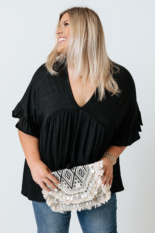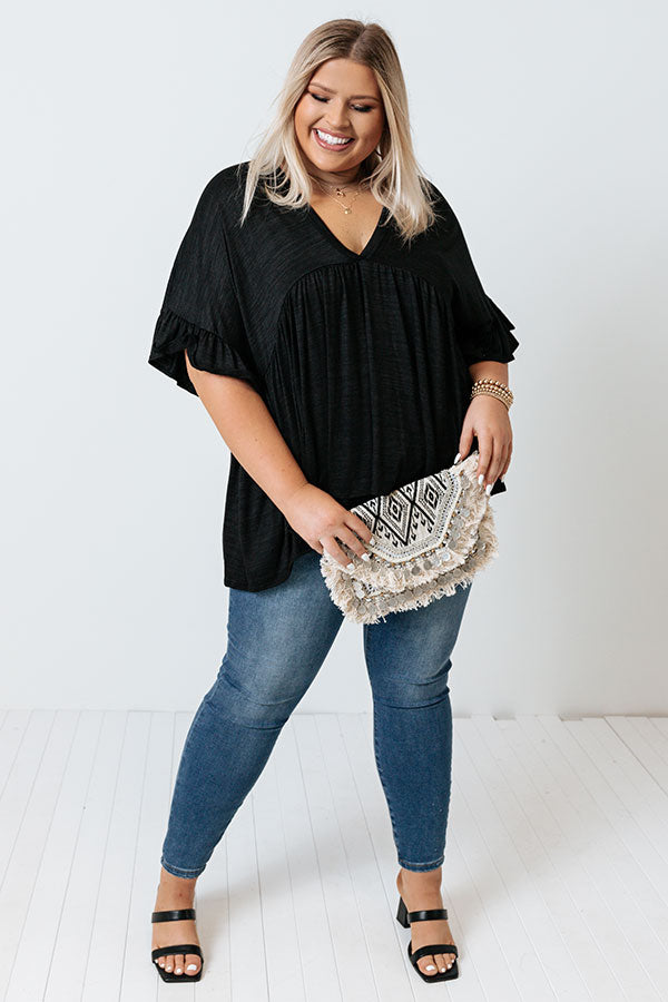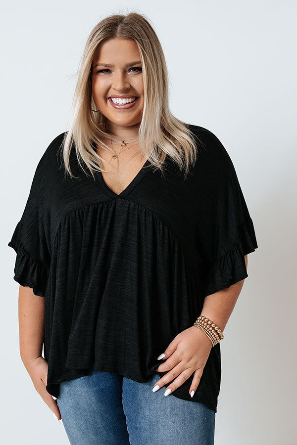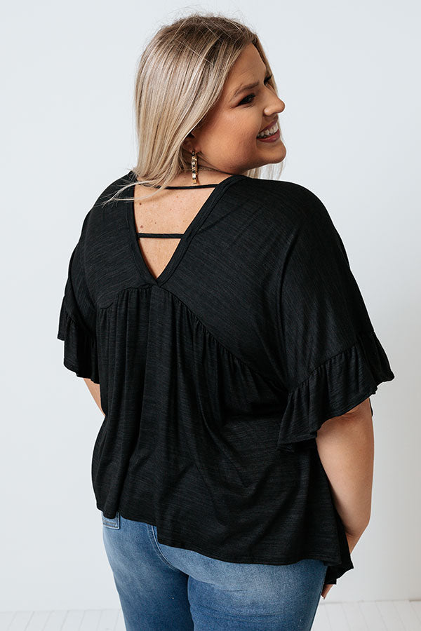 Plus Size - Dance into summer looking adorable in this cute black top featuring lightweight breezy material, a v-cut neckline and upper back with a two strap closure, short loose sleeves with ruffled trim detailing, and a relaxed babydoll silhouette that falls into an uneven hemline! Measurements