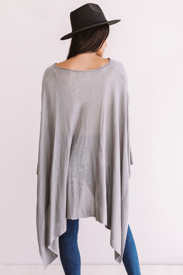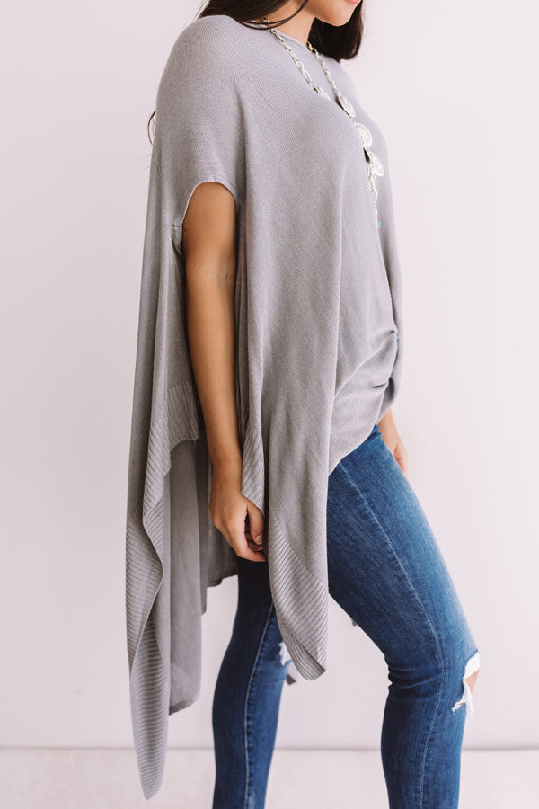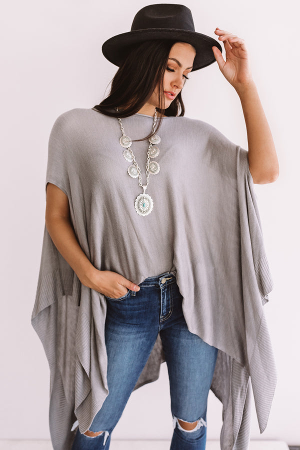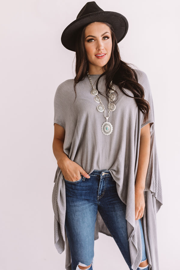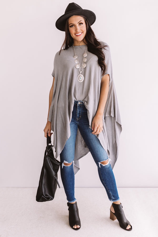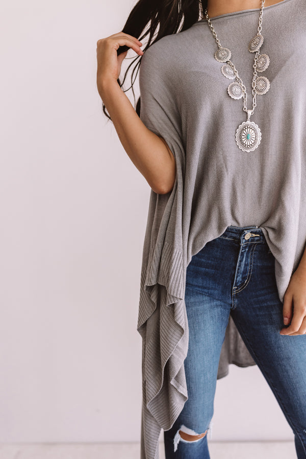 This grey shift tunic will have you "dancing until daylight" with its lightweight tight knit material, high rounded neckline, short sleeves, and ultra draped silhouette that falls into a long uneven hemline! This cozy transitional piece styles perfectly with some distressed ankle skinnies, a turquoise statement necklace, and a black peep toe bootie, tote, and faux suede hat, or you can front tuck it into our "Sweet Victory High Waist Corduroy Skirt in Wine" with "The Seraphina Faux Leather Wedge in Grey" for a variety of looks that people are sure to FALL in love with! Measurements