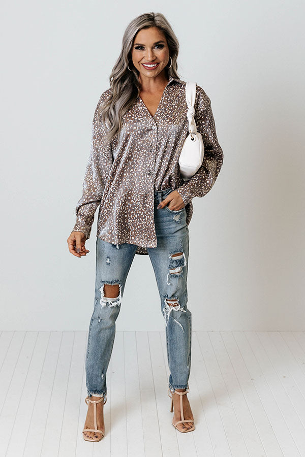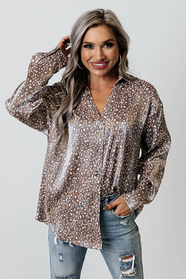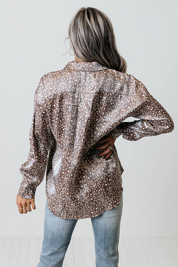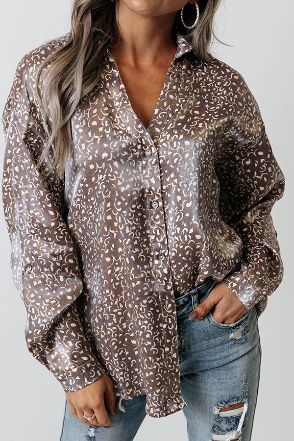 Live life carefree in our adorable purple 'Dancing In The Street' top featuring lightweight shimmery material patterned with a brown and white leopard print, a button down front with a collared neckline, long loose sleeves with button closure cuffs, and a relaxed silhouette that falls into a rounded hemline!