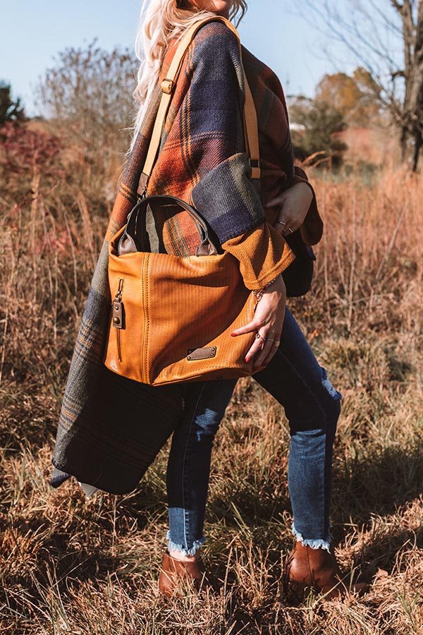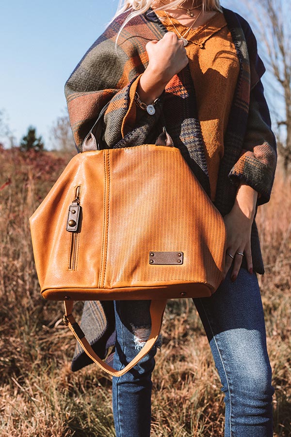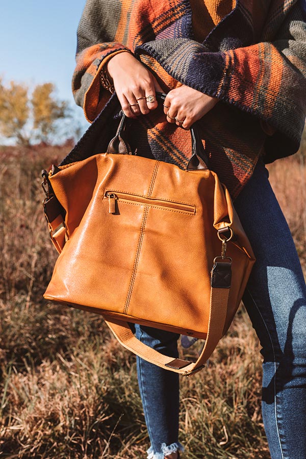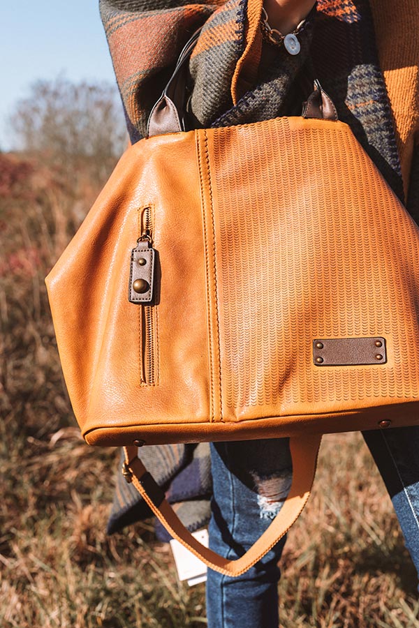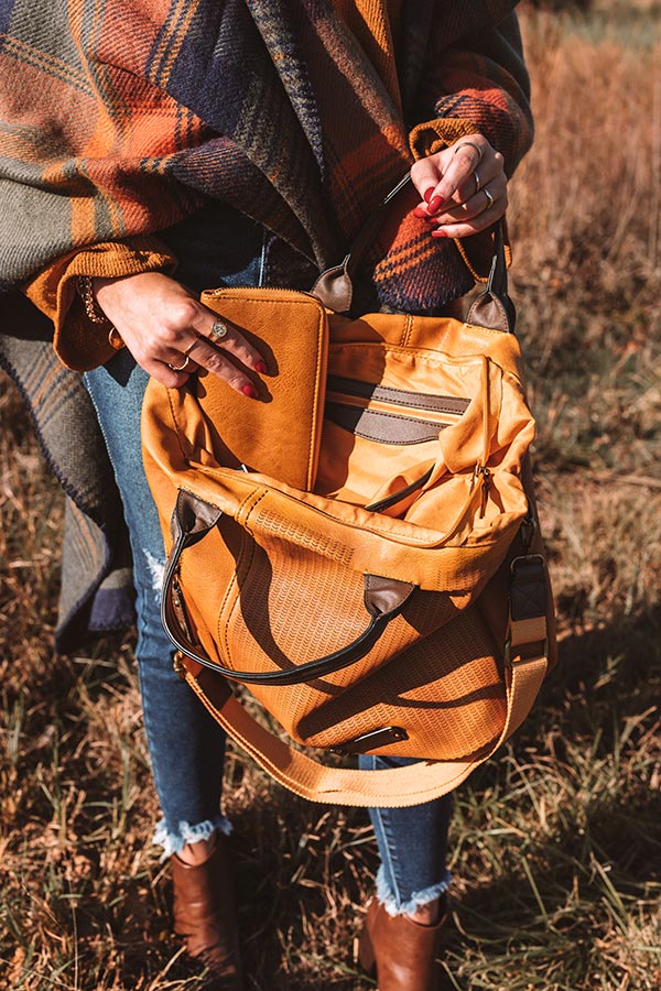 You are sure to be a dapper darling when you accessorize with this stunning golden honey colored tote featuring sleek faux leather material, an accent front and back zip, two tote handles, an adjustable and removable crossbody strap, and a spacious lightweight fully lined pouch with additional inside pockets and a zip closure! PLUS, it includes a matching wallet!