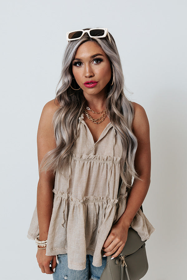 Arrive to brunch with the girls looking darling in this adorable warm taupe colored top featuring lightweight flowy material with subtle chevron texturing, a v-cut neckline with a tie closure, wide sleeveless shoulder straps, ruffled accent seams, and a relaxed tiered silhouette that falls into a straight tunic-length hemline! Measurements