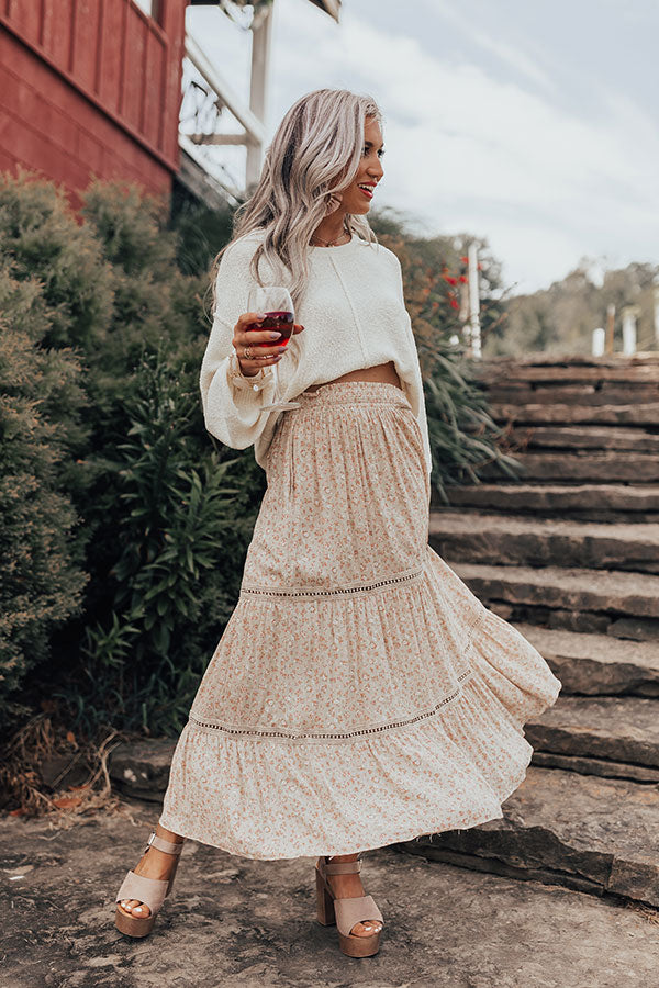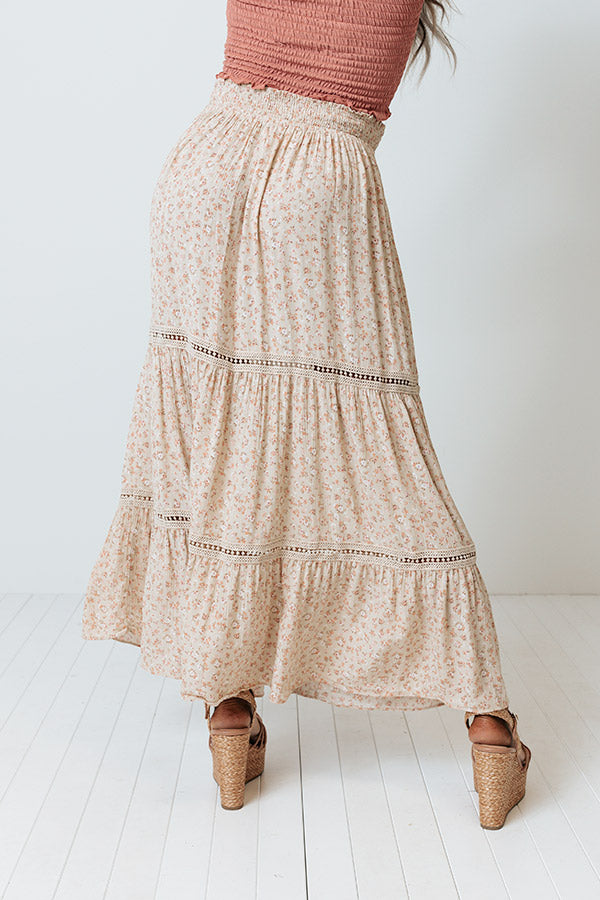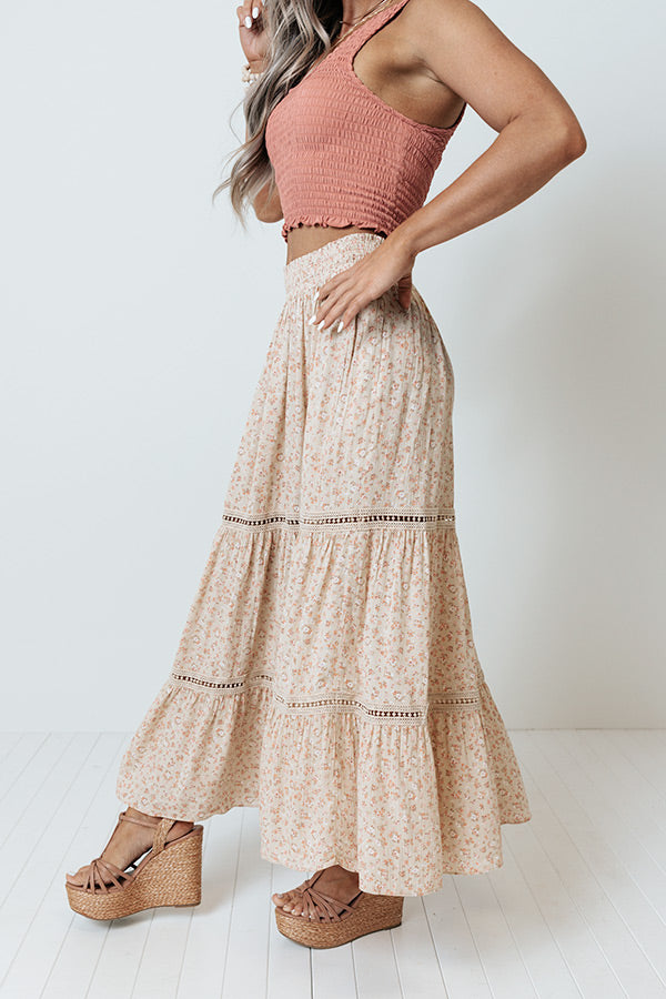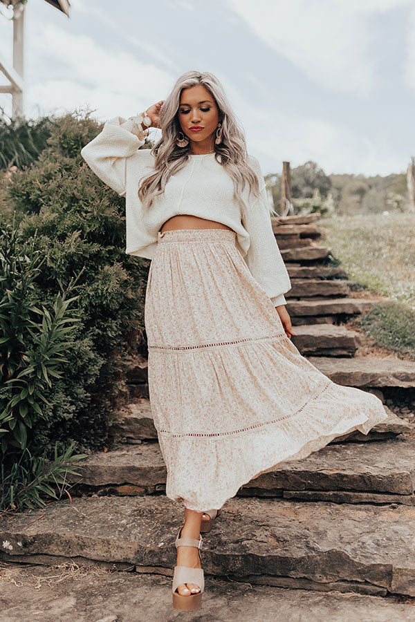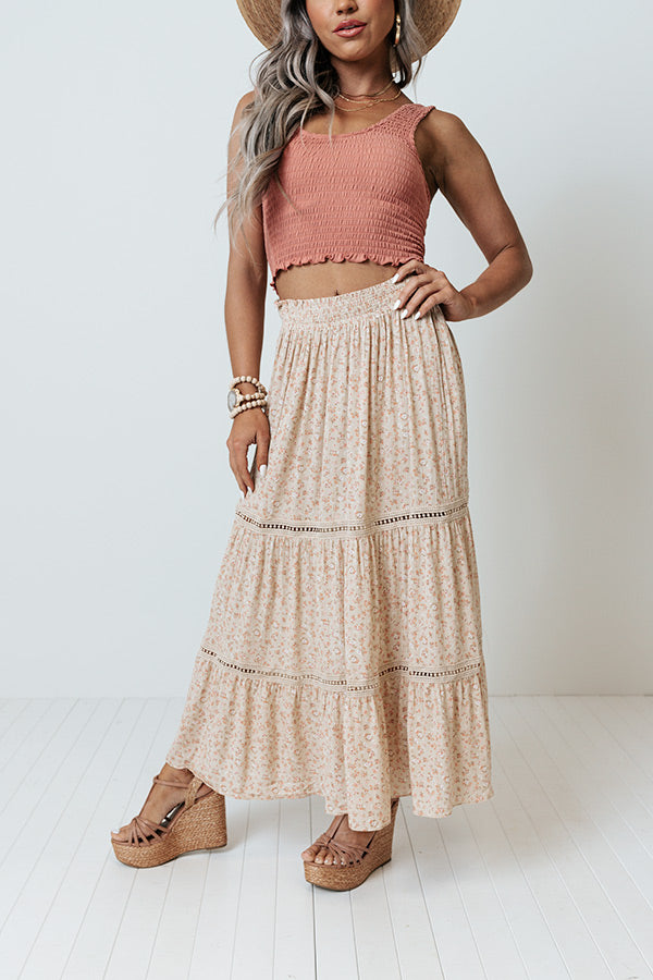 We have no doubt you will look absolutely darling in this summery midi skirt featuring lightweight flowy material patterned with a tiny blush hued floral print, a wide smocked waistline, and an ultra relaxed tiered silhouette that cascades into a straight mid-calf length hemline! Measurements