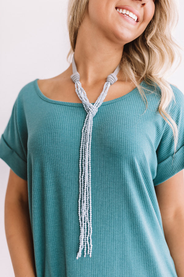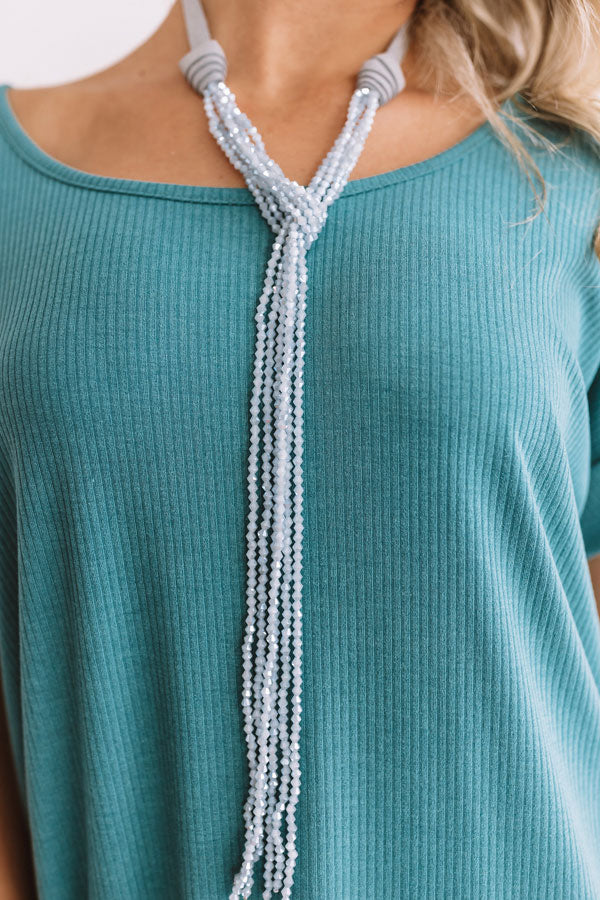 When getting ready for a "date night out," complete your look with this statement necklace featuring long strands of light blue hued crystal beads!