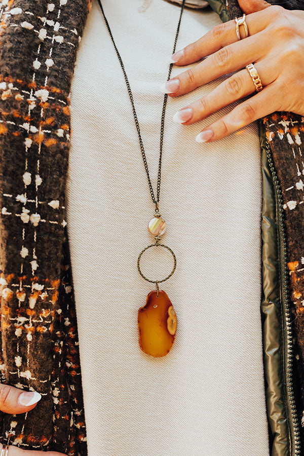 Make a bold statement with our stunning 'Dawn Dreaming Agate Necklace! Features a long bronze chain with a flat bead and stamped hoop accent, and an oversized agate stone. Due to the natural stones, there may be some variations in size, shape and color.