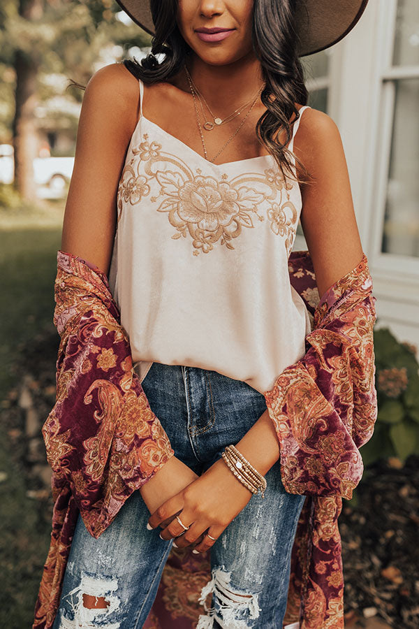 Elevate your layering pieces with our gorgeous champagne hued 'Dawn Dreaming' shift tank featuring lightweight material with beautiful embroidered detailing, a wide v-cut neckline with adjustable spaghetti straps, and a relaxed silhouette that falls into a straight hemline!
