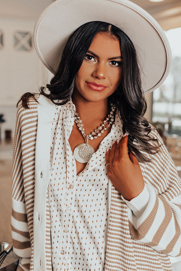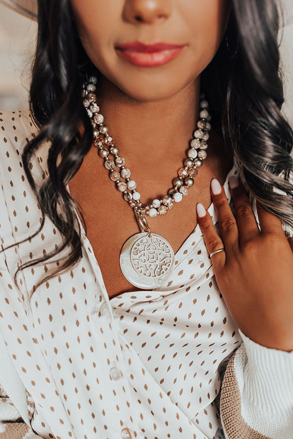 Add a touch of charm to your outfit with our 'Dawn Of Time' semi precious necklace featuring two strands of beige hued stone beads alternating with shimmering crystal, and gold-toned accent beads, toggle closure, and a large pendant with ivory and beige hues paired with a beautifully patterned gold-toned filigree pendant to compliment it as the centerpiece.