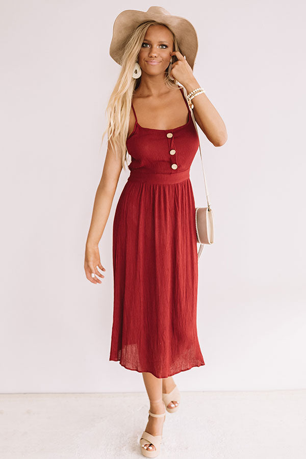 You will slay all day in this crimson midi adorned with a racerback with adjustable spaghetti straps, button up bodice, smocked waistline, and semi sheer straight fit skirt! PLUS, it features a sewn in slip! Style this sweetie with a matching platform heel, crossbody, and faux suede hat or with patterned accents like our "Jenner Snake Print Heel" and "After Hours Snake Print Clutch" for the perfect "dawn till dusk" outfit! Measurements