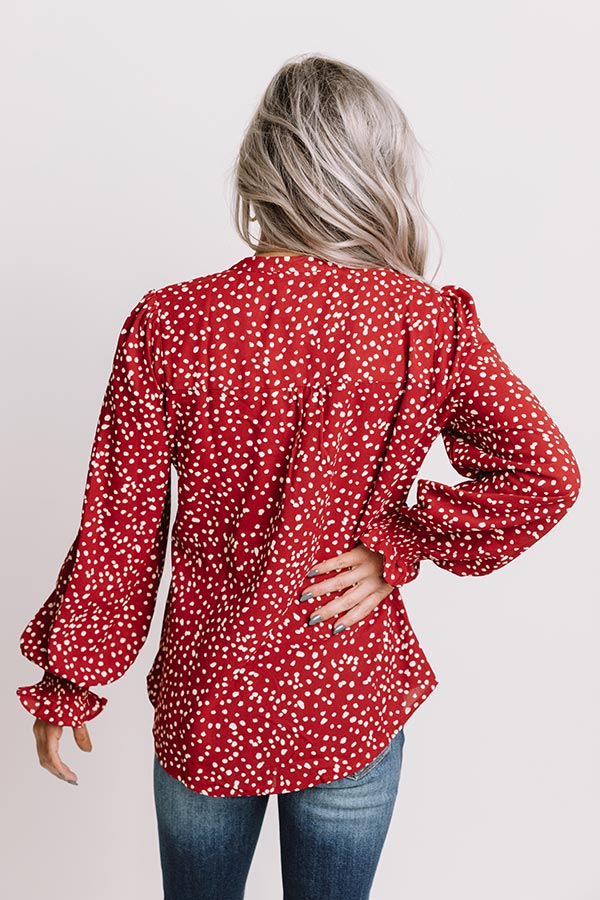There is no better piece to take your from day to night than this adorable crimson shift top featuring lightweight material patterned a white spotted pattern, long bishop sleeves with smocked cuffs, a v-cut neckline, and a relaxed silhouette that falls into a rounded hemline! Measurements